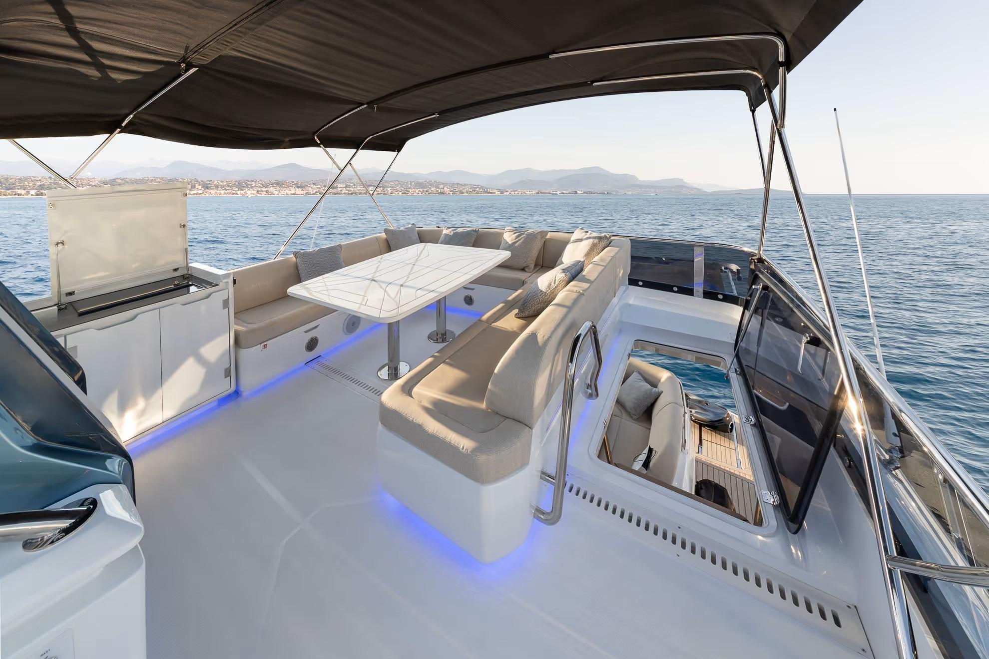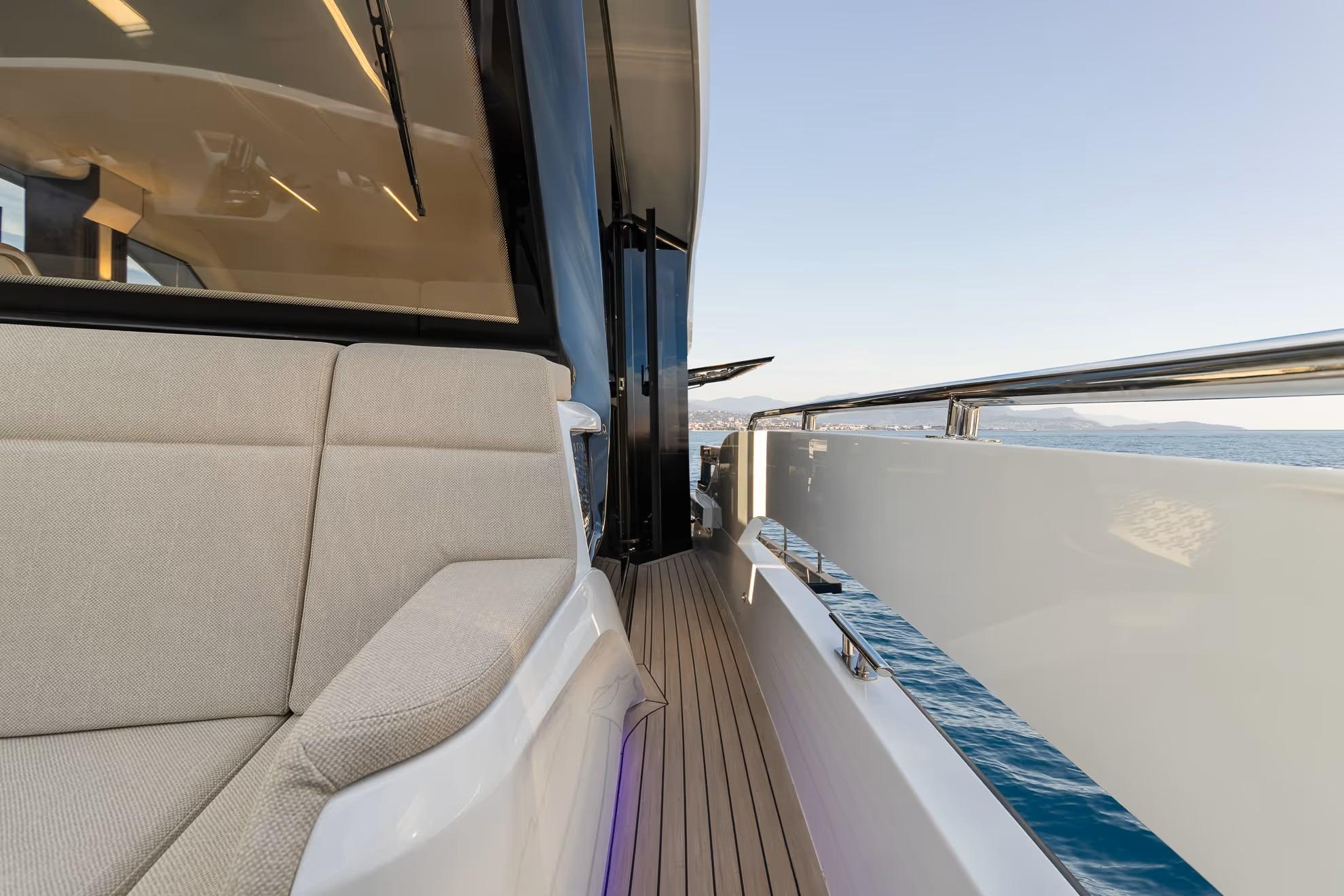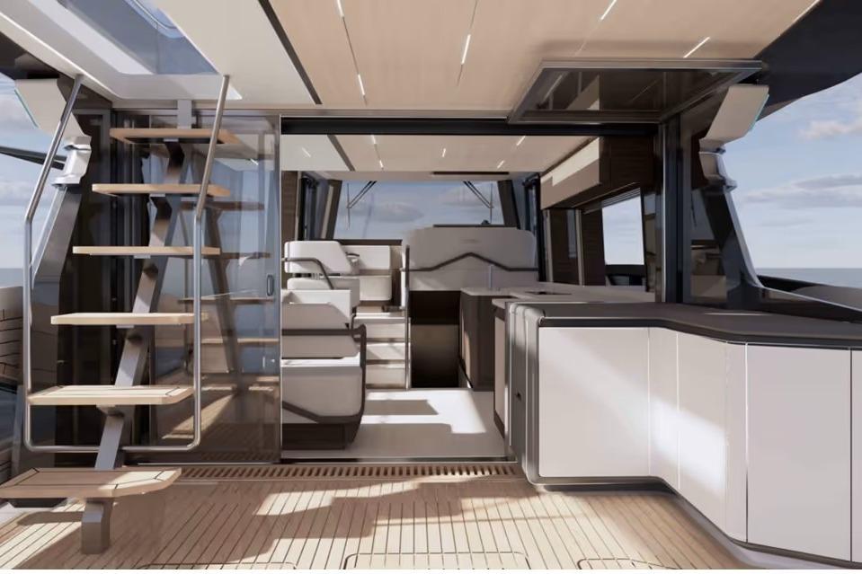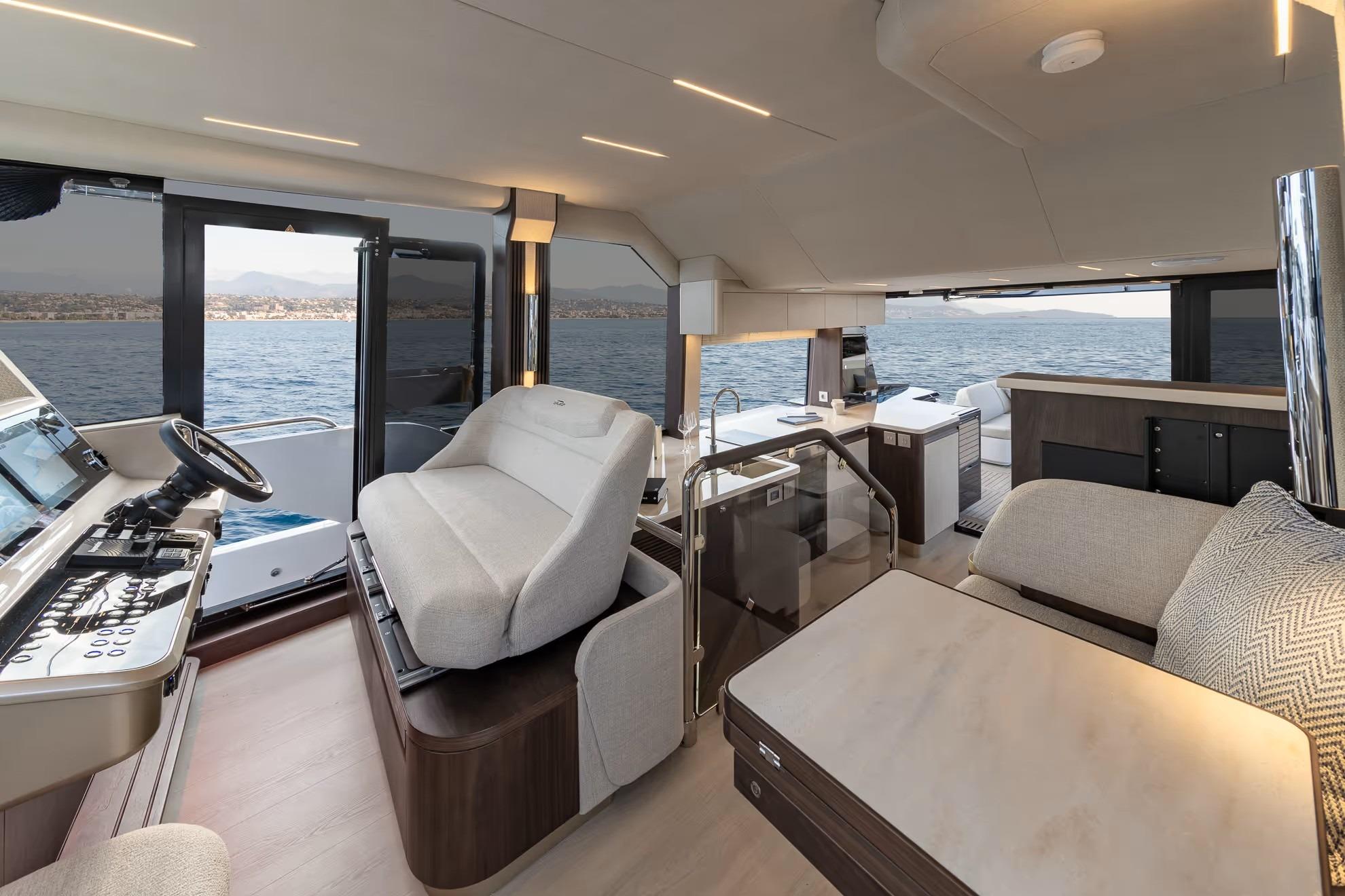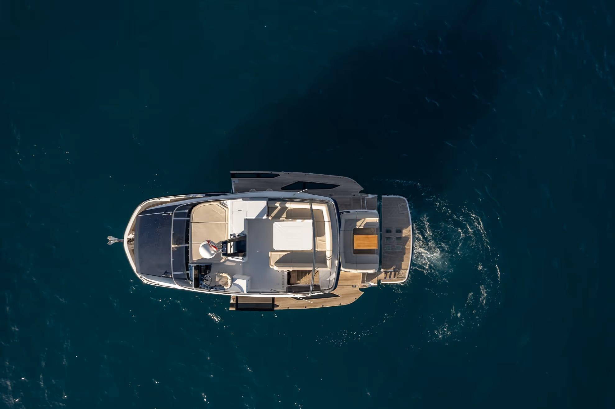 On deck, the 430 Exp emphasizes versatility and safety. Wide side decks, sturdy handrails, and non-skid surfaces make maneuvering around the boat easy, even in adverse conditions. The expansive aft cockpit provides plenty of room for gear, water toys, or fishing setups, with thoughtful storage and operational ergonomics throughout.