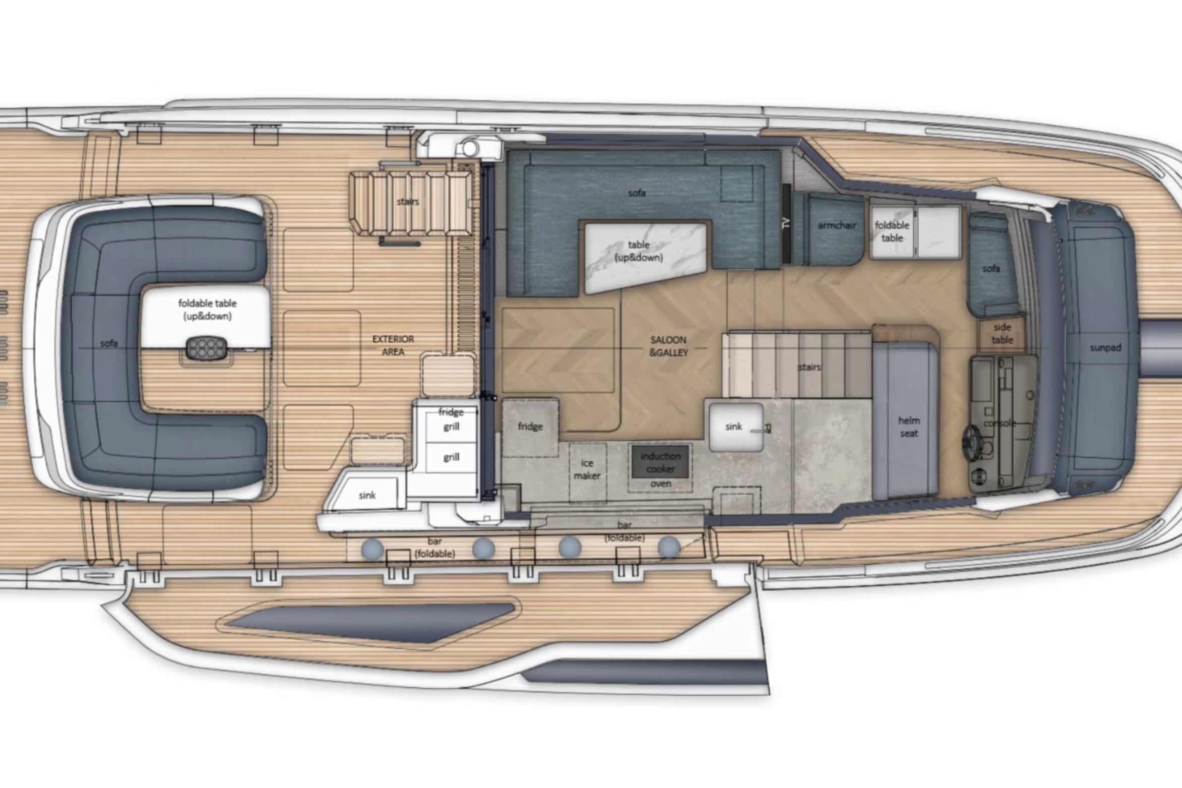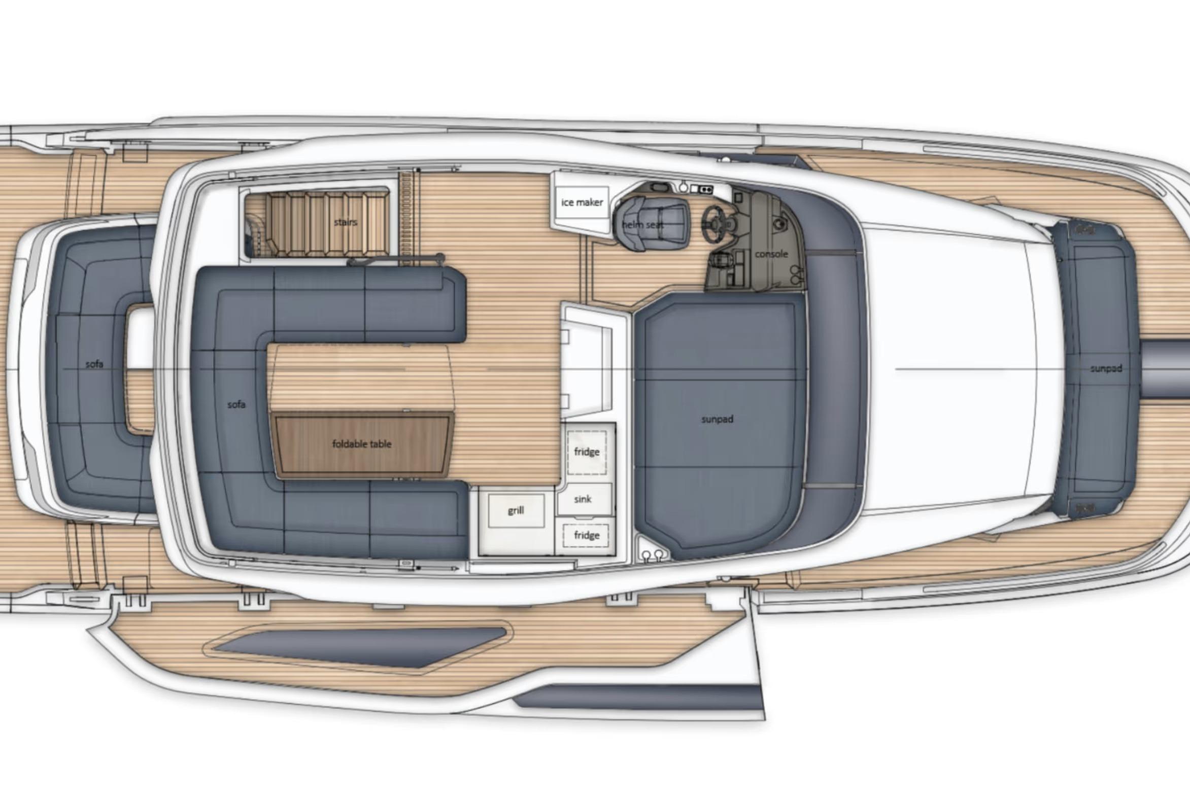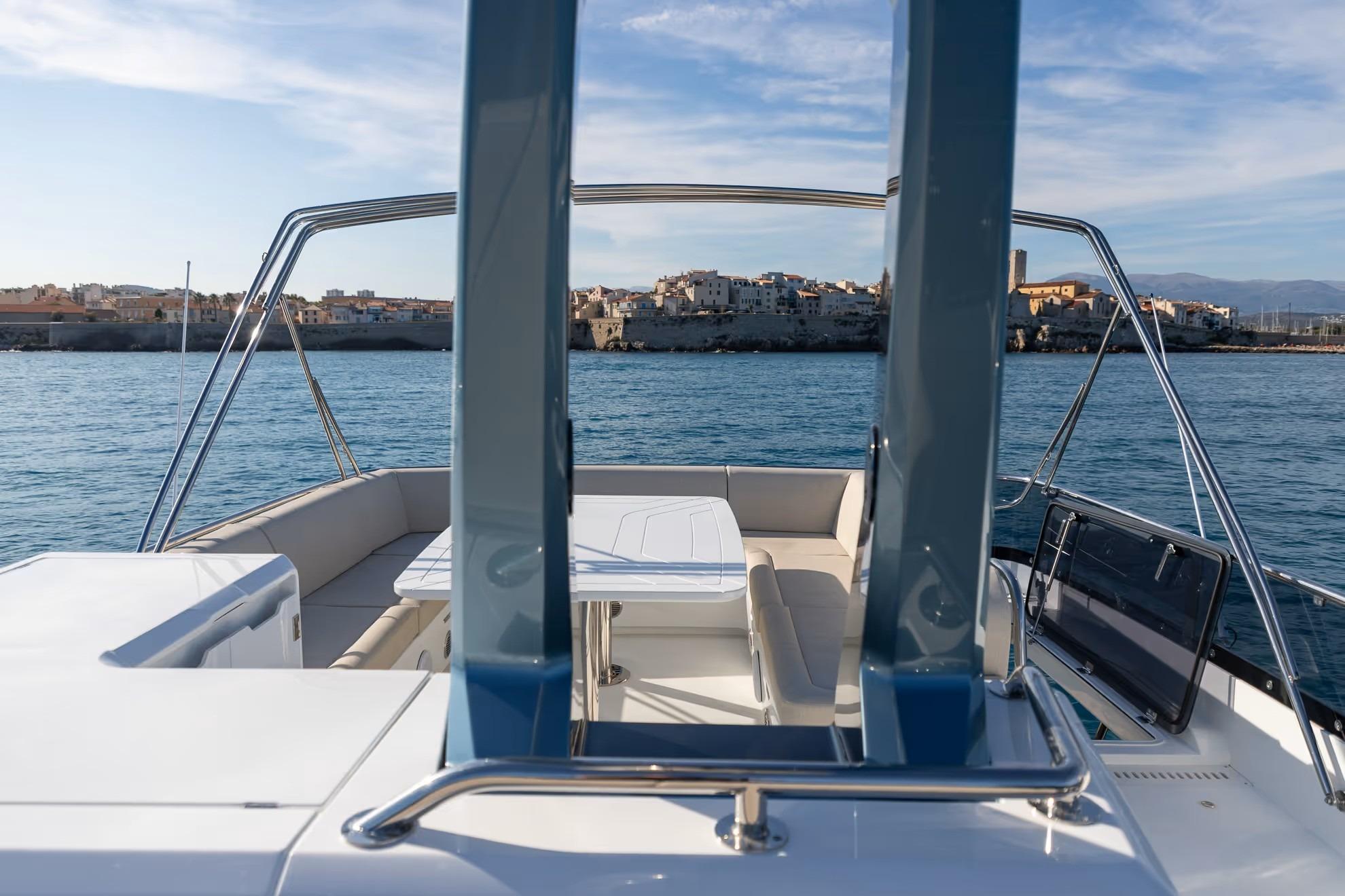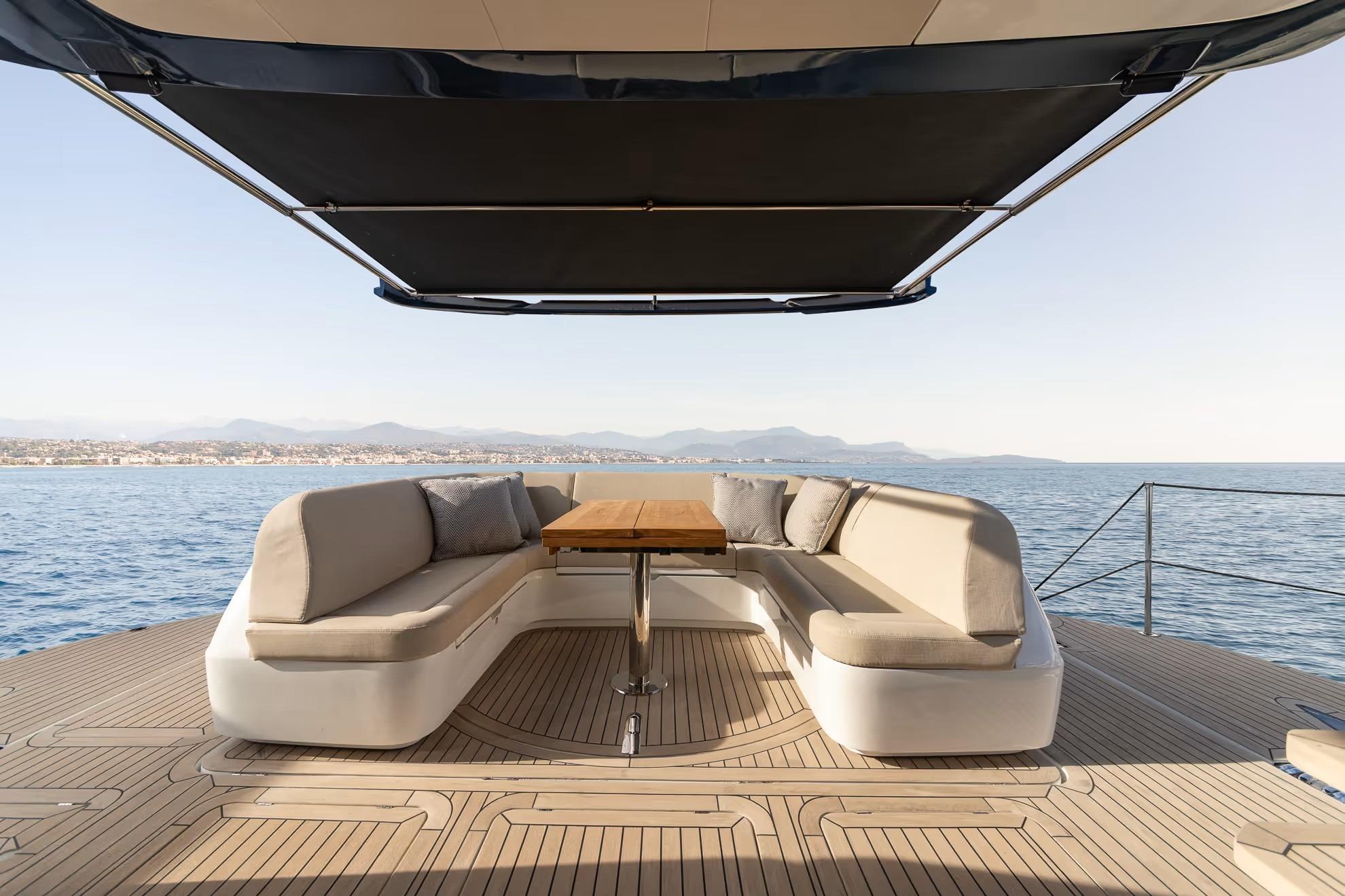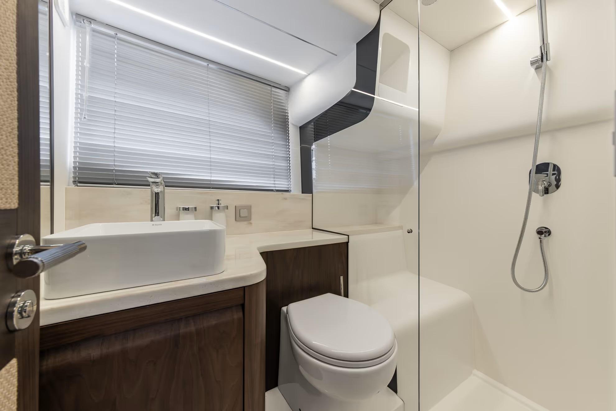 On deck, the 430 Exp emphasizes versatility and safety. Wide side decks, sturdy handrails, and non-skid surfaces make maneuvering around the boat easy, even in adverse conditions. The expansive aft cockpit provides plenty of room for gear, water toys, or fishing setups, with thoughtful storage and operational ergonomics throughout.