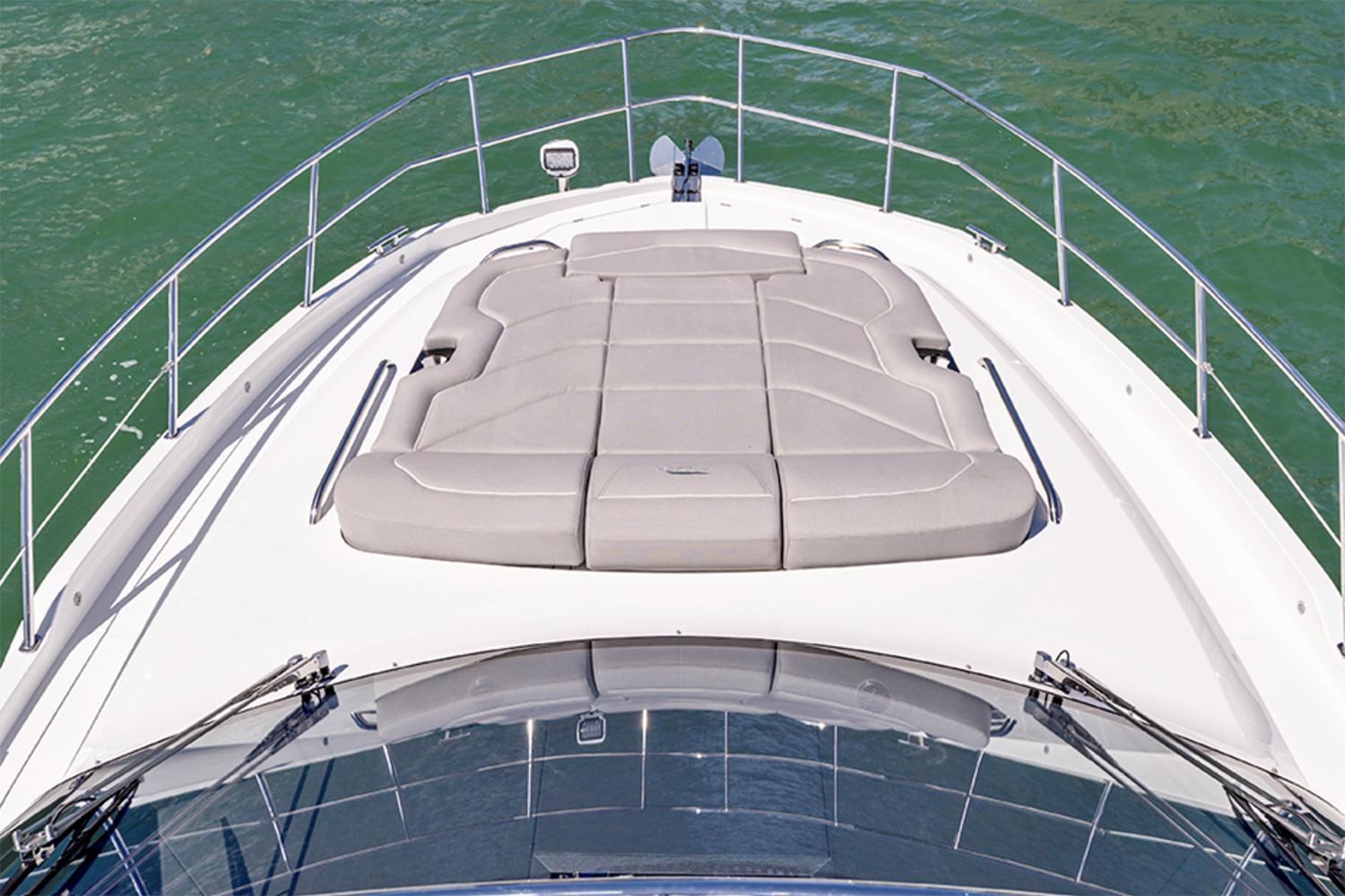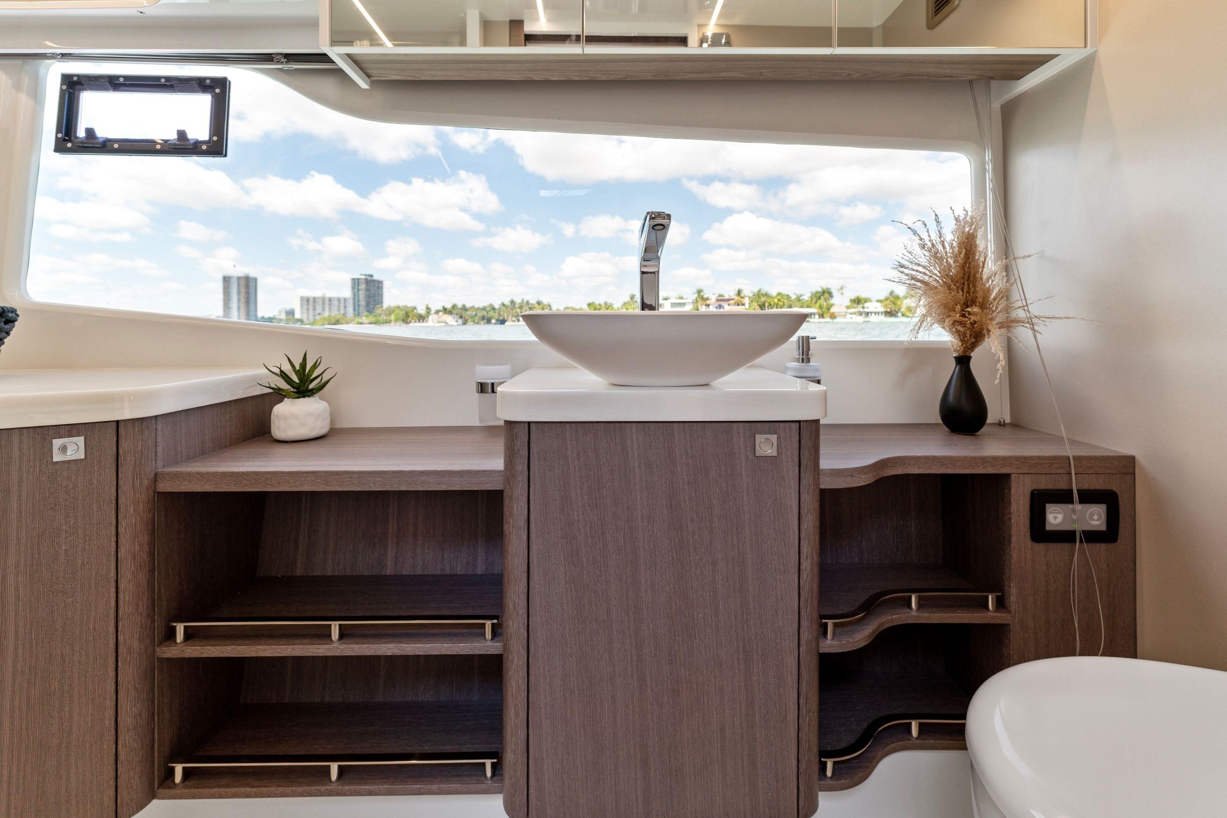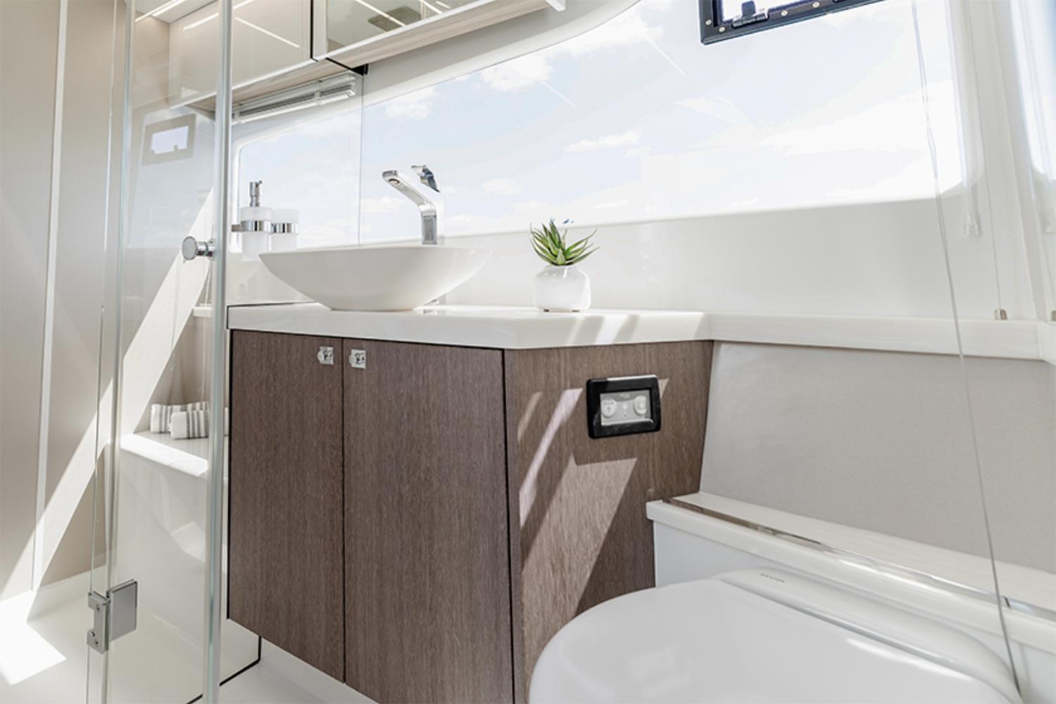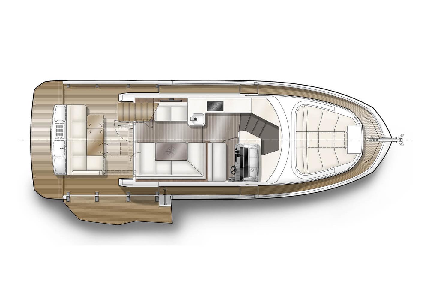 The sleek exterior marks another collaboration with the esteemed Tony Castro Design Studio and is quickly recognizable as it follows the trends set by the fourth generation of Galeon yachts. The top deck features a helm station with a settee port side for a companion, with the main rest area moved back. The L-shaped sofa wraps around the elongated table and will seat six in comfort. The cockpit allows for boarding from all sides thanks to the full-sized hydraulic stern platform and Beach Mode with semi-glazed panels. Drop down both sides to extend the usable space during mooring and invite your guests to activities like diving, fishing or sunbathing! Inside, a classic layout can be found with the rest area moved back, divided from the cockpit only by the sliding glass doors. Galley and helm station are moved forward with two or three cabins located on the lower deck. The two cabin option will accommodate four passengers in style, as both the mid-ship master and the forward VIP offer significant volume and storage space. For larger parties a choice between two different, three cabin layouts is available with bunk beds or twin cabin setups. Both bathrooms down below are fitted with a head and shower with standing height.