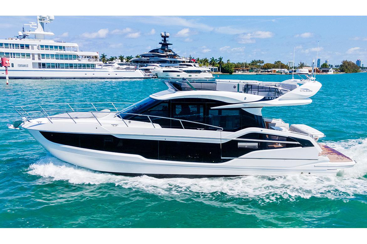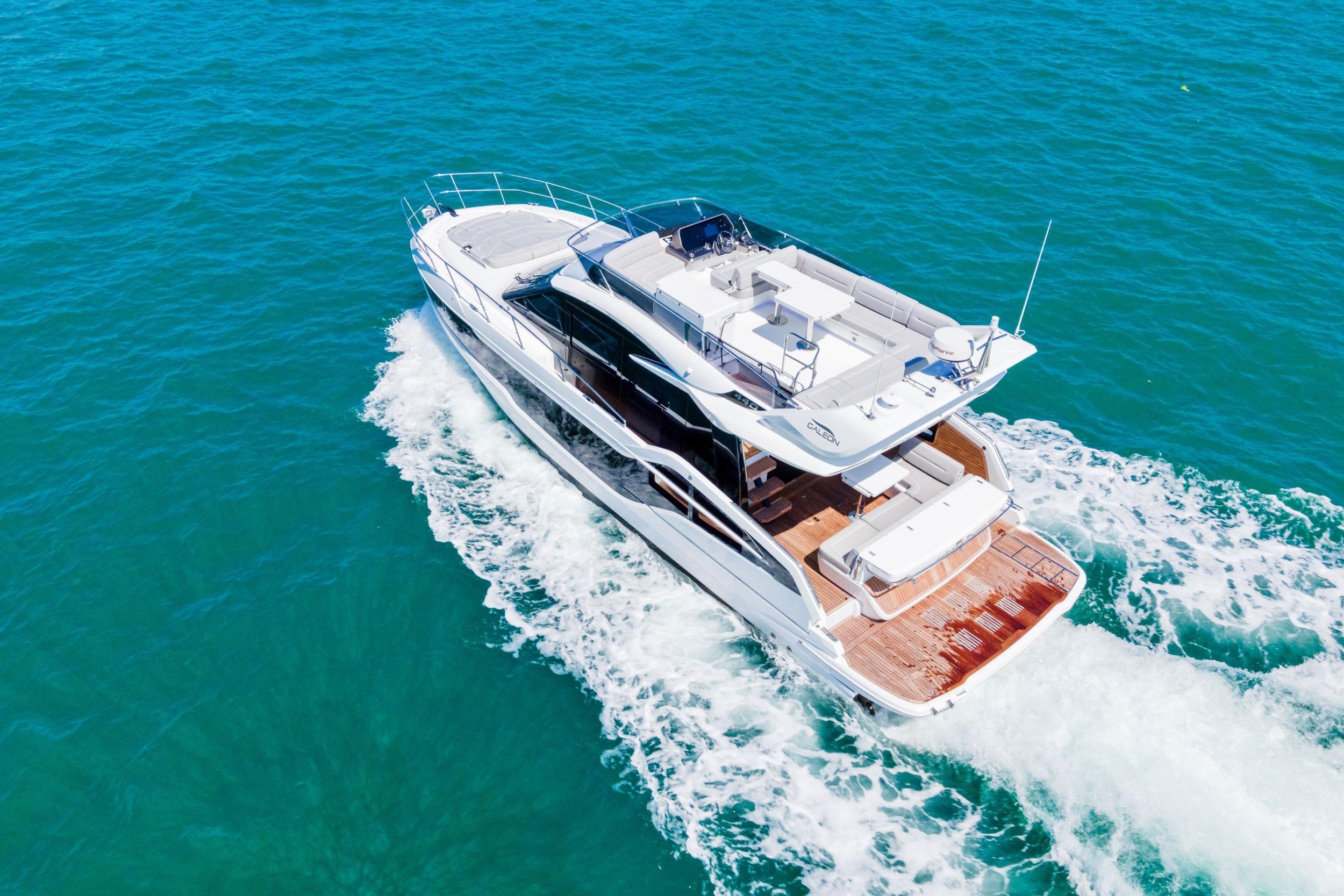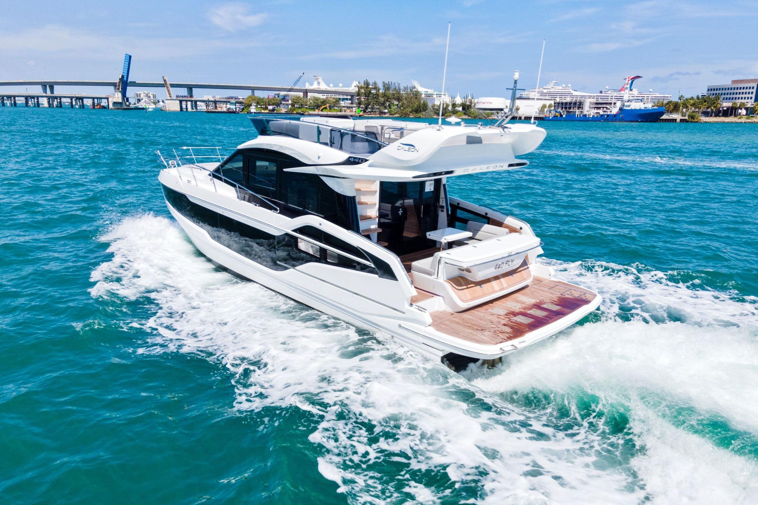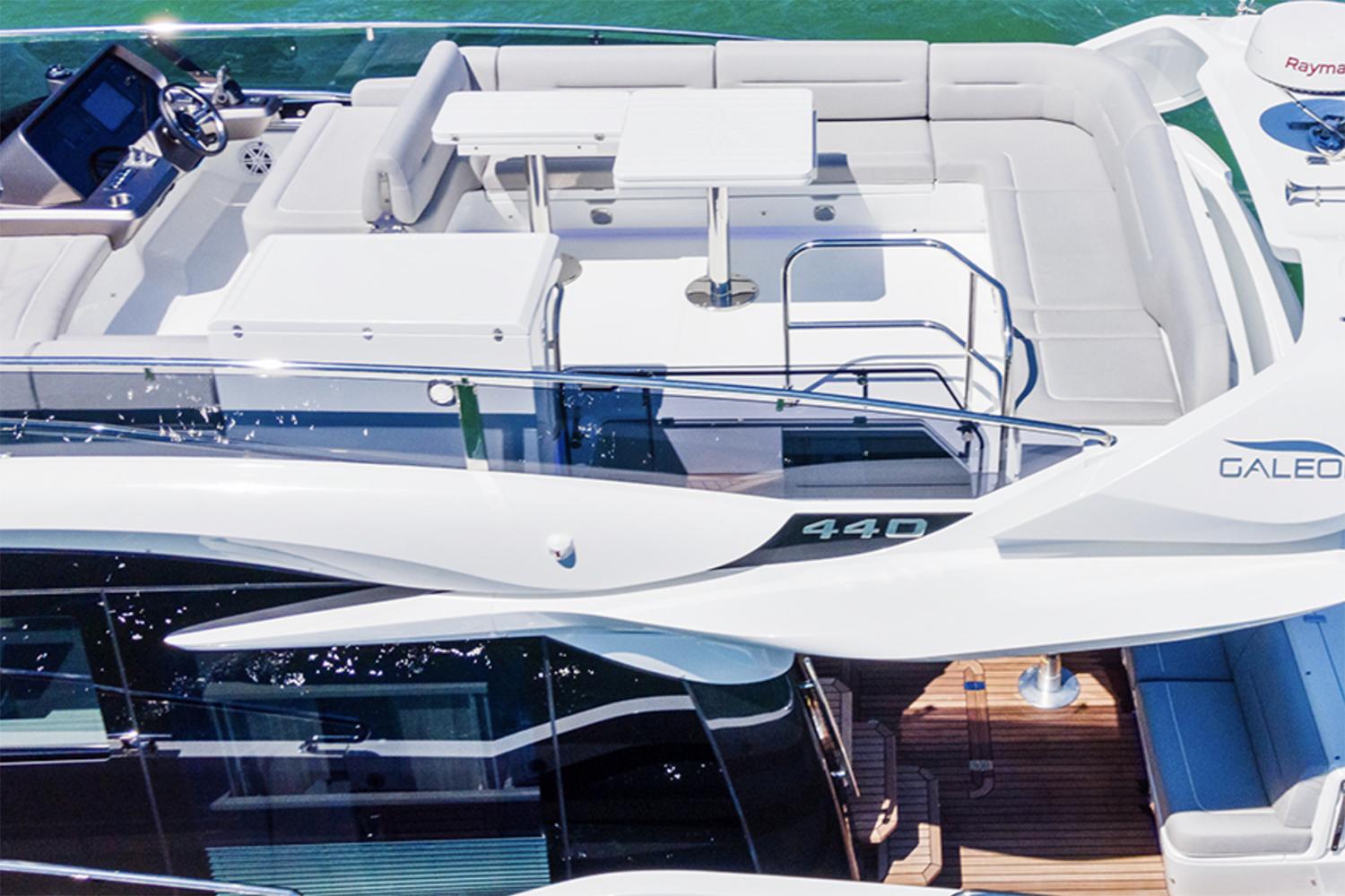 Galeon has leveraged all of its storied boatbuilding experience to create the 440 FLY, a medium-sized motoryacht packed with intelligent innovations and a fresh approach to onboard space distribution. The yacht has a sleek exterior and unmistakable Galeon DNA in regards to this boat’s aesthetic appeal. A dynamic silhouette combines with sporty accents throughout to create a boat that looks like it is moving even when it is standing still. As for exterior and interior living spaces, practicality and versatility were of utmost importance during the design phase of this model. The Galeon 440 FLY can be configured for either two or three cabin layout and comes available with a variety of luxury finishes and a comprehensive list of additional features that allow for maximum customization.