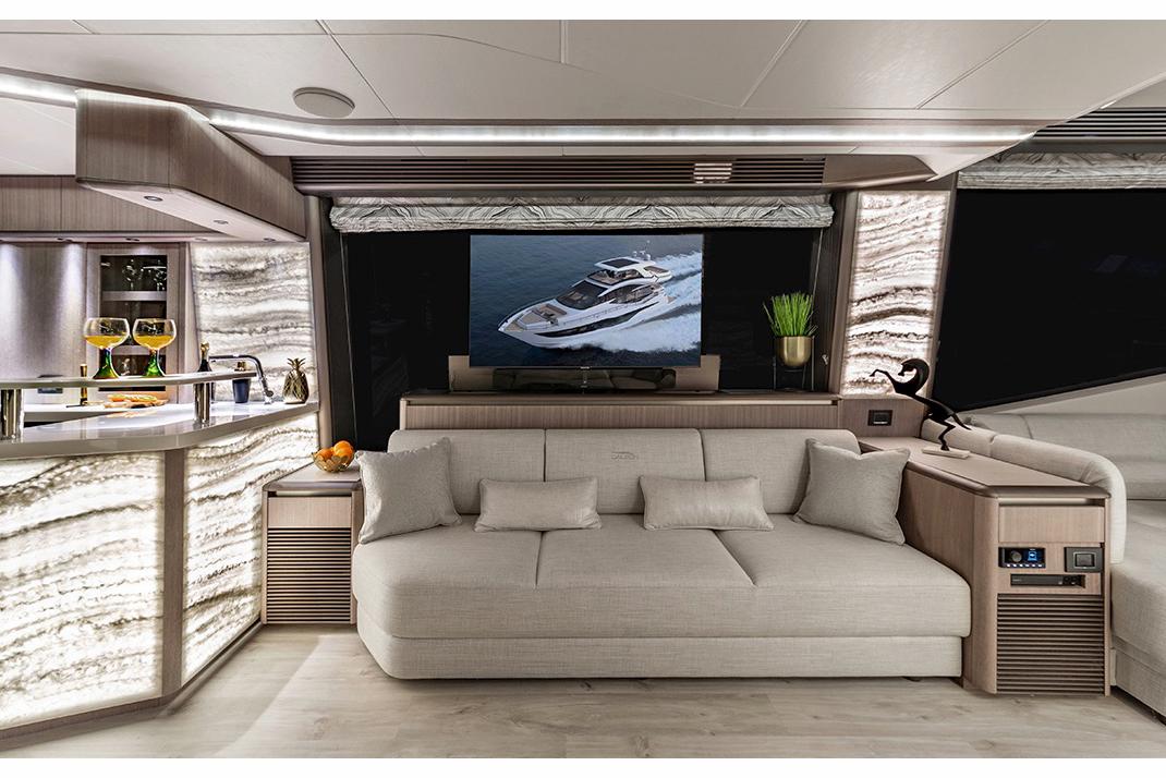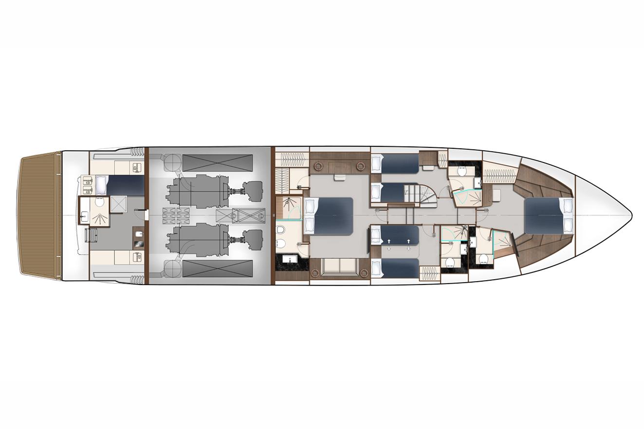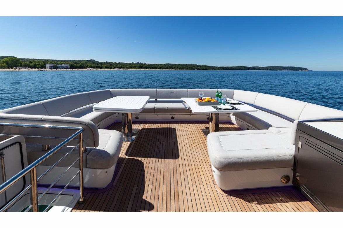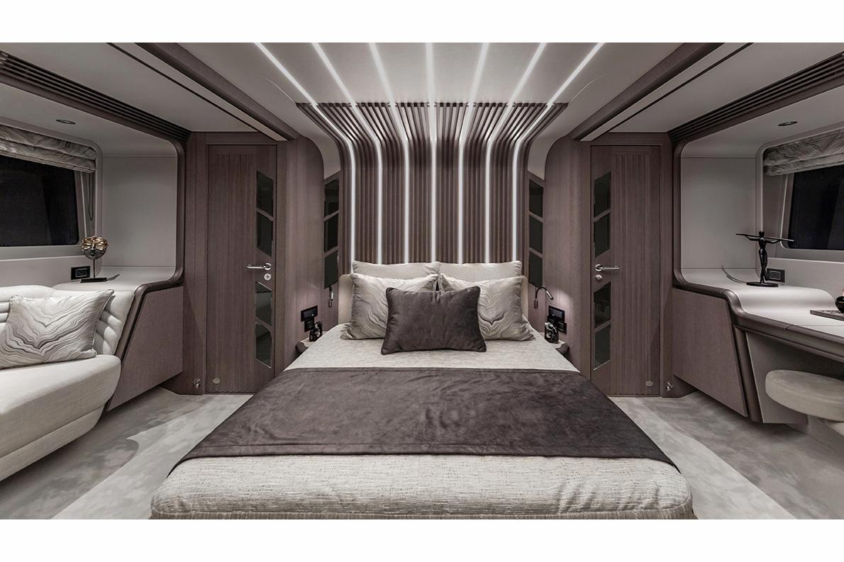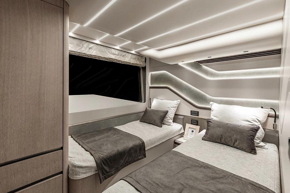 Structure elements made of carbon fiber allowed to increase the surface of the upper deck, so we can offer there not only a double helmsman’s position, fully equipped bar, a comfortable sunbathing area, four tables that can be adapted to the needs of guests, but also two separate, huge, semicircular sofas between which we have integrated very stylishly the jacuzzi. On the main deck, we can enjoy the interiors that bring to mind the best apartments. A richly equipped galley with a refined kitchen island attracts attention. Next to the double helmsman’s station you can find a comfortable sofa with a coffee table, and right next to it, a majestic table for 8 people. The tastefully decorated living room offers, apart from elegant sofas that tempt you to spend a longer time comfortably on them, also unusually large windows, a pull-out TV, a modern bar and a separate day toilet.
