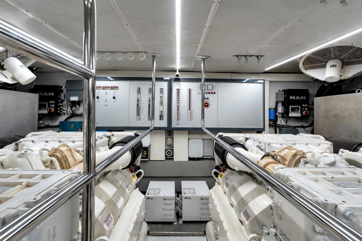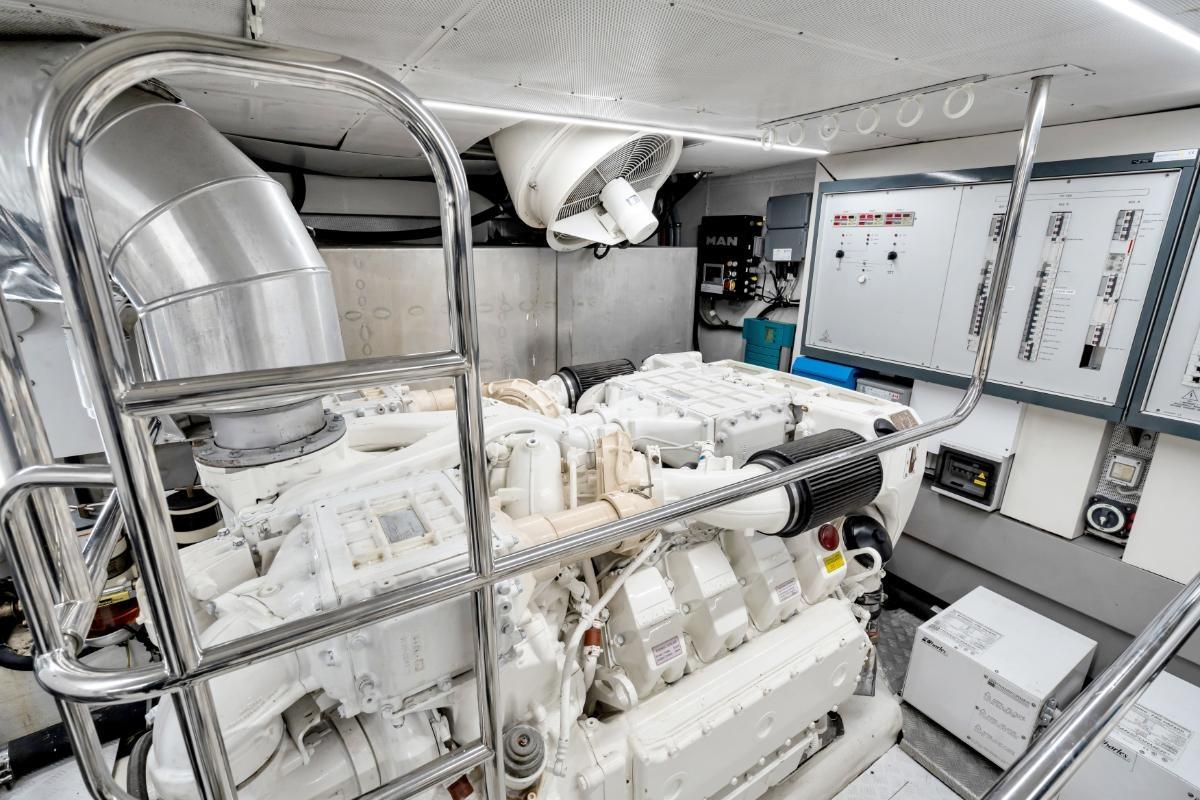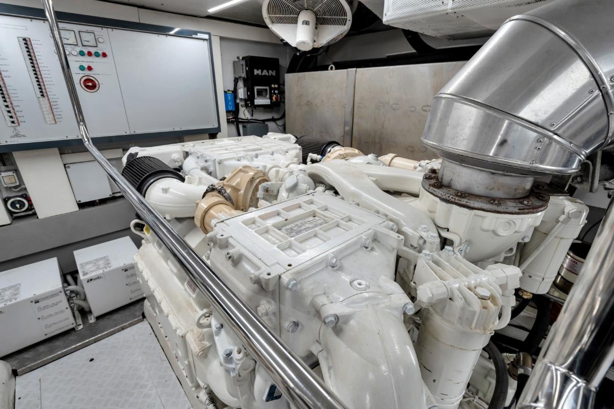 - Well maintained and reliable 1200 HP V8 MAN shaft drive engines propel her to a top speed of over 30 knots or comfortable cruising speeds between 20-26 knots.