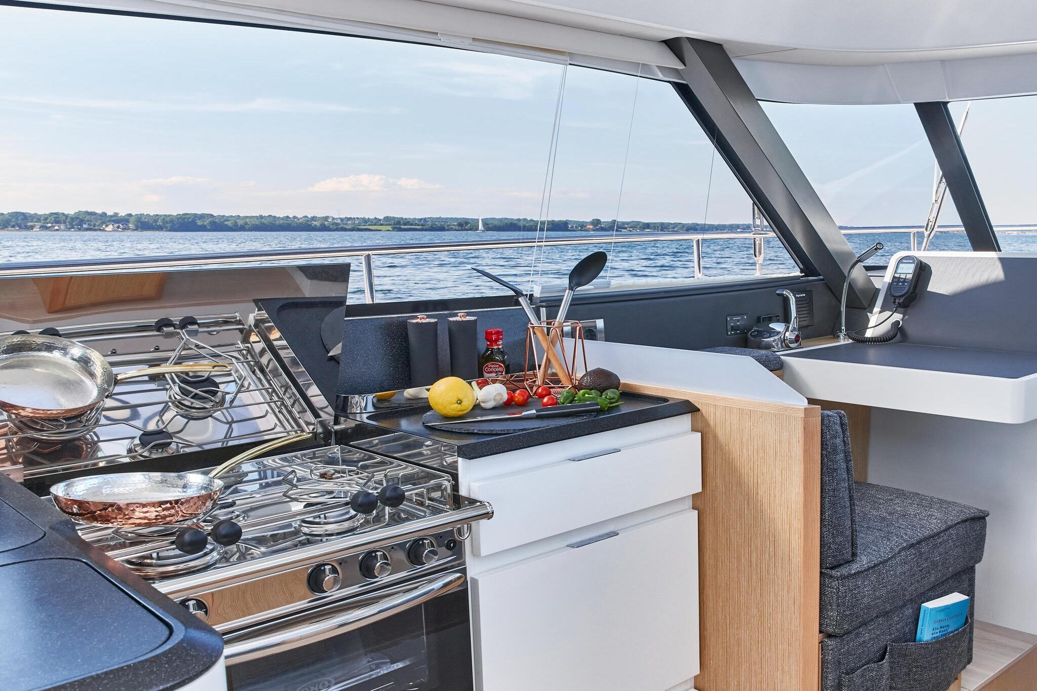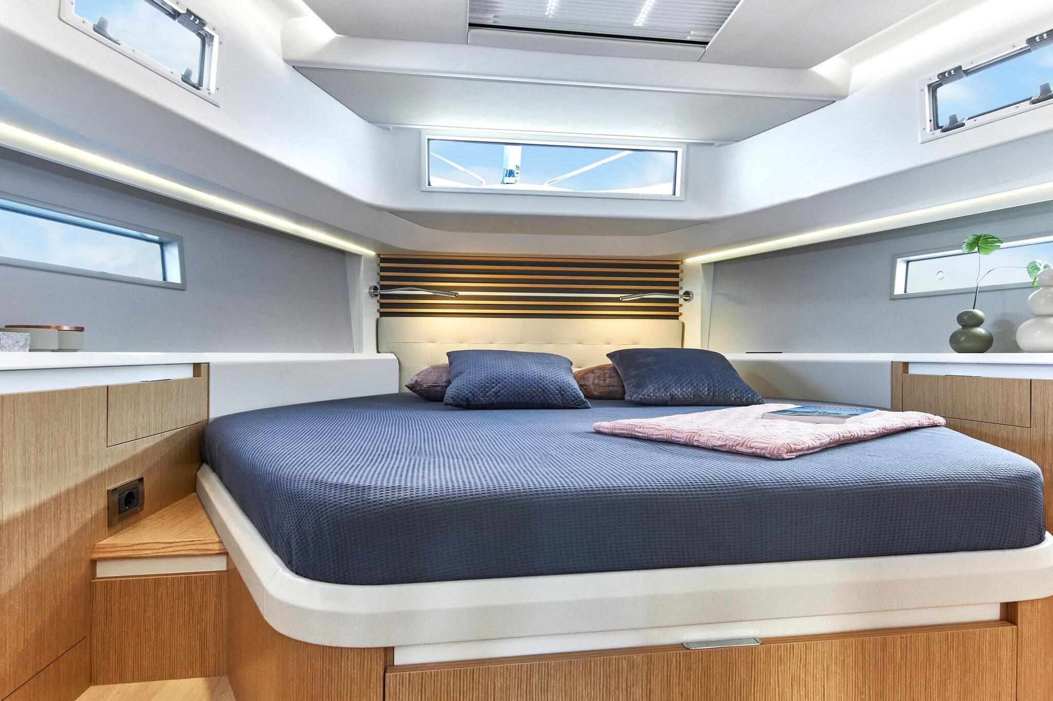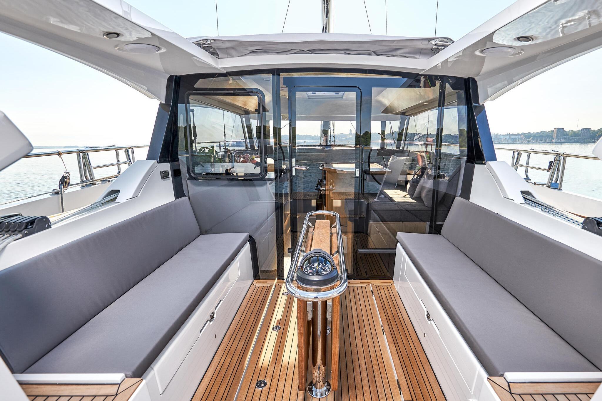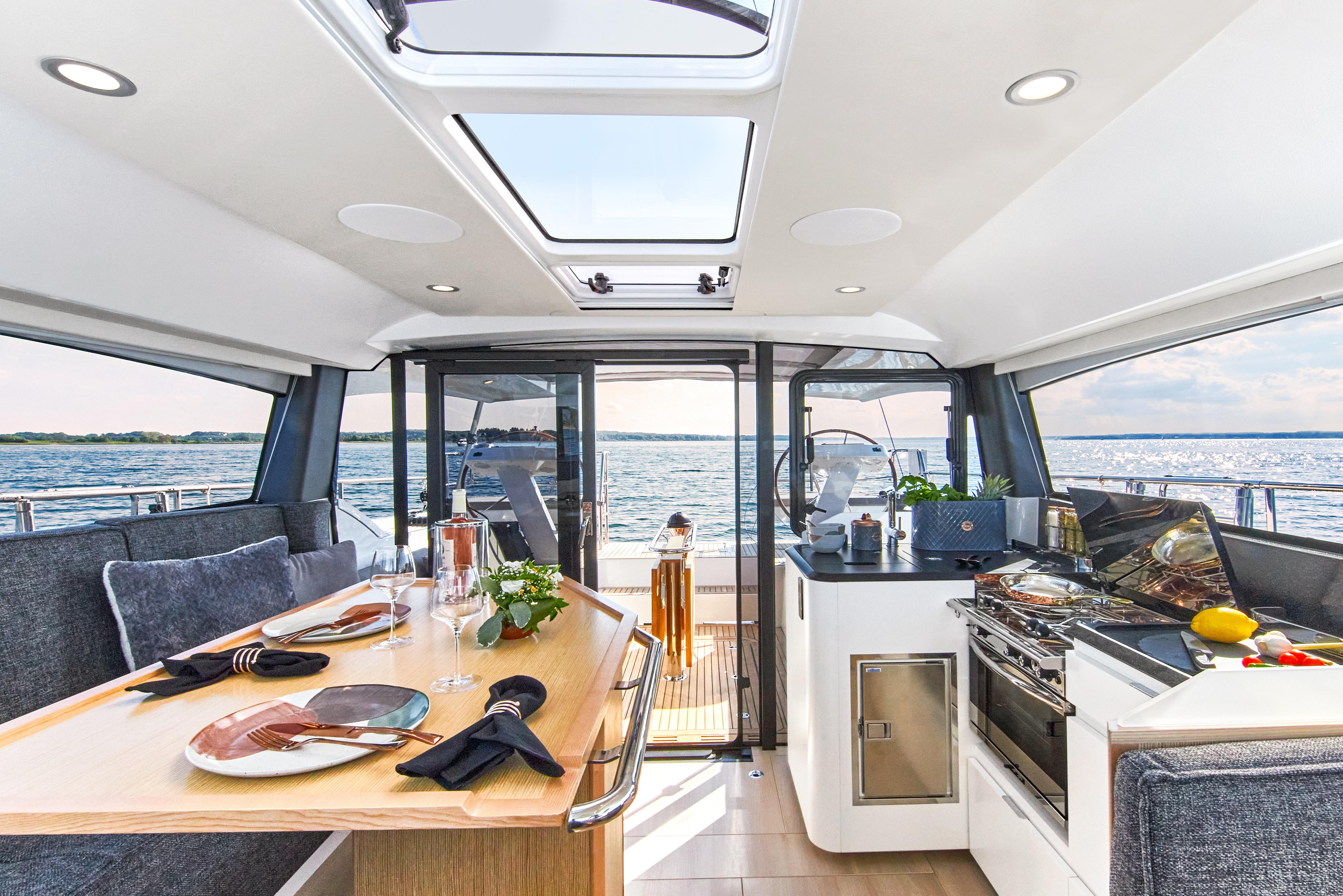 The philosophy of living on one level has been implemented relentlessly in the Moody Decksaloon 41. The elegant deckhouse featuring 360° panorama glazing makes you feel as if you are living in the lap of luxury, whatever the weather. With its exemplary suitability for all weather conditions, the Moody Decksaloon 41 lives up to the Moody tradition in every way. She is a masterpiece of the art of modern boat-building and engineering.