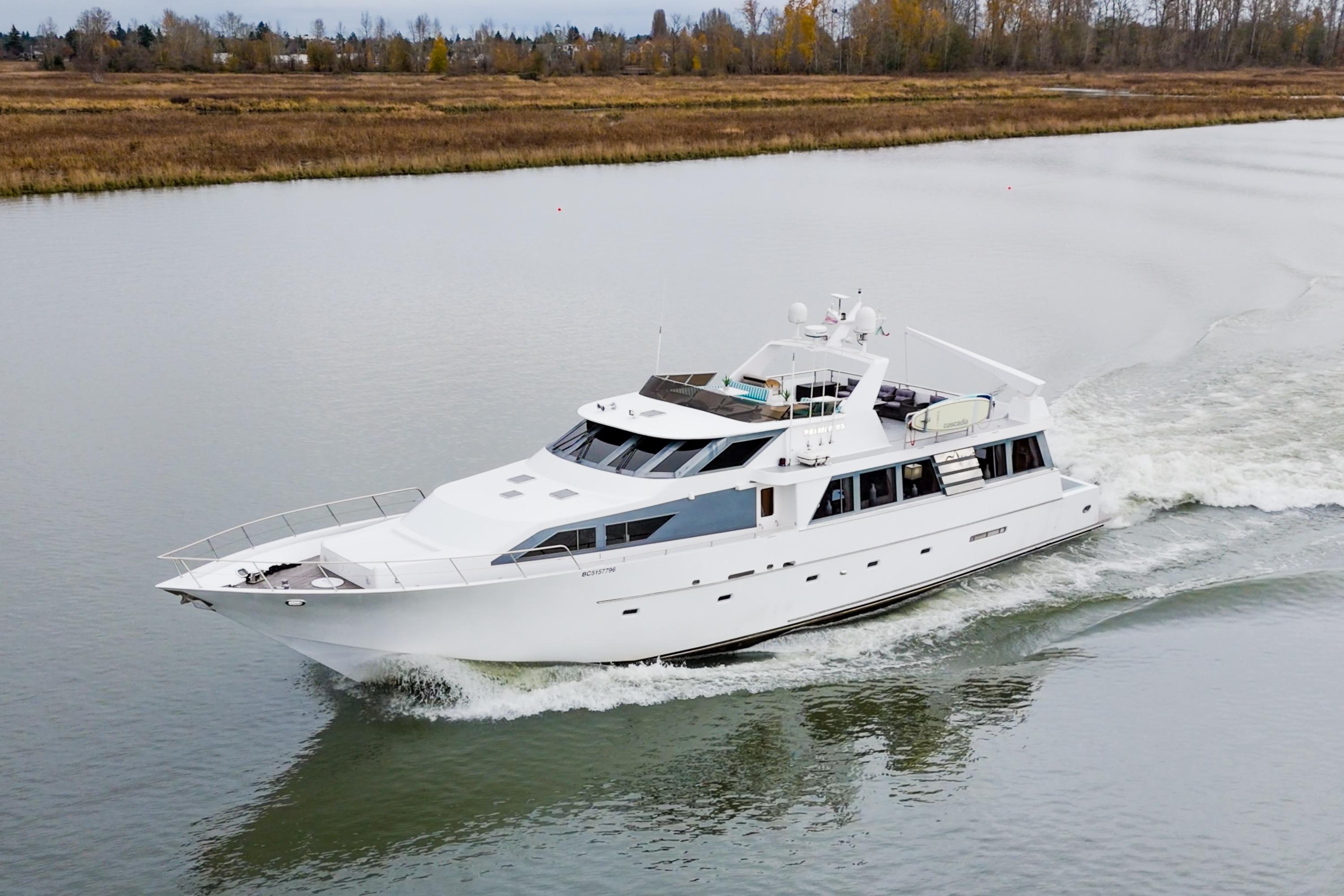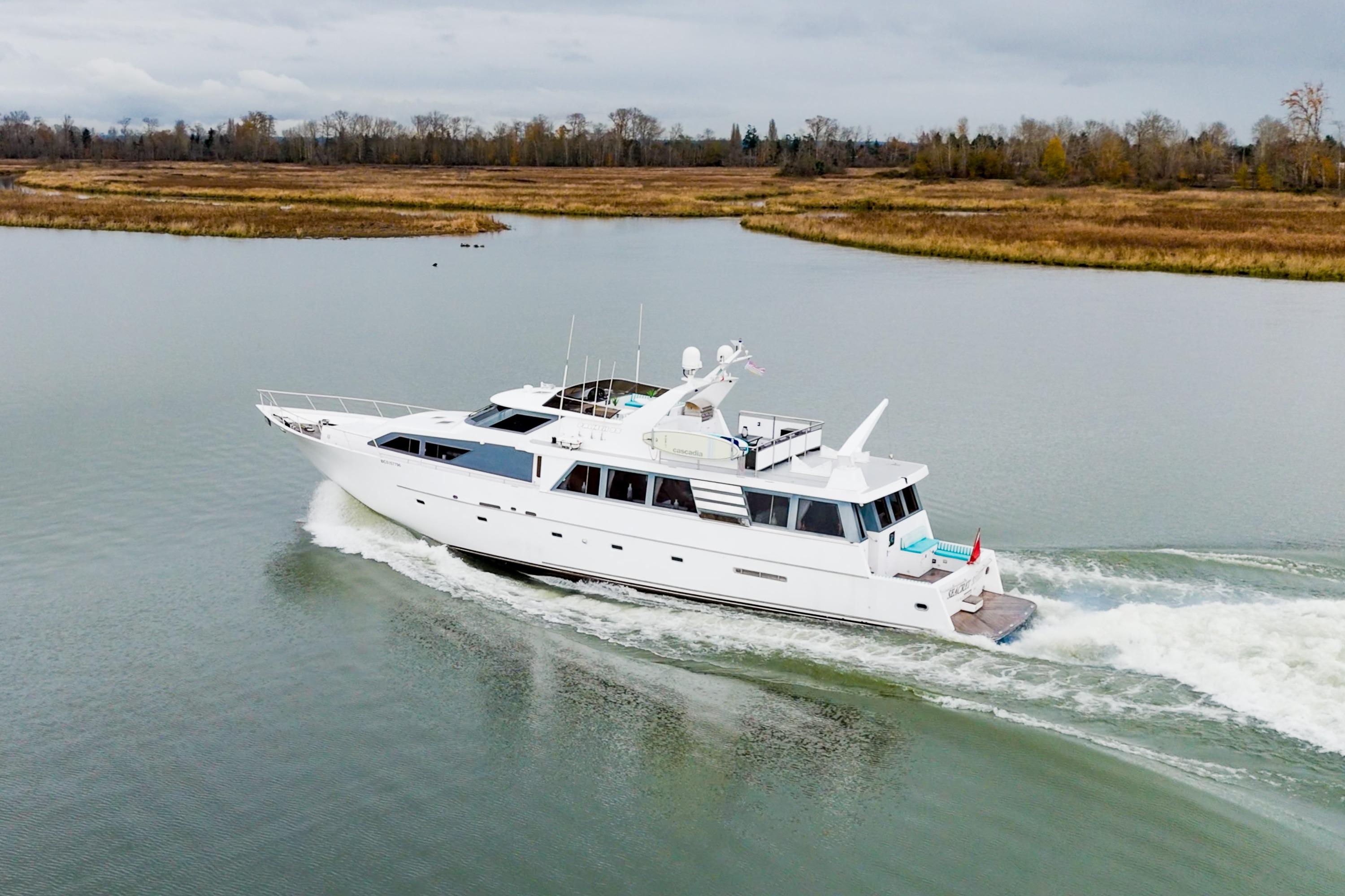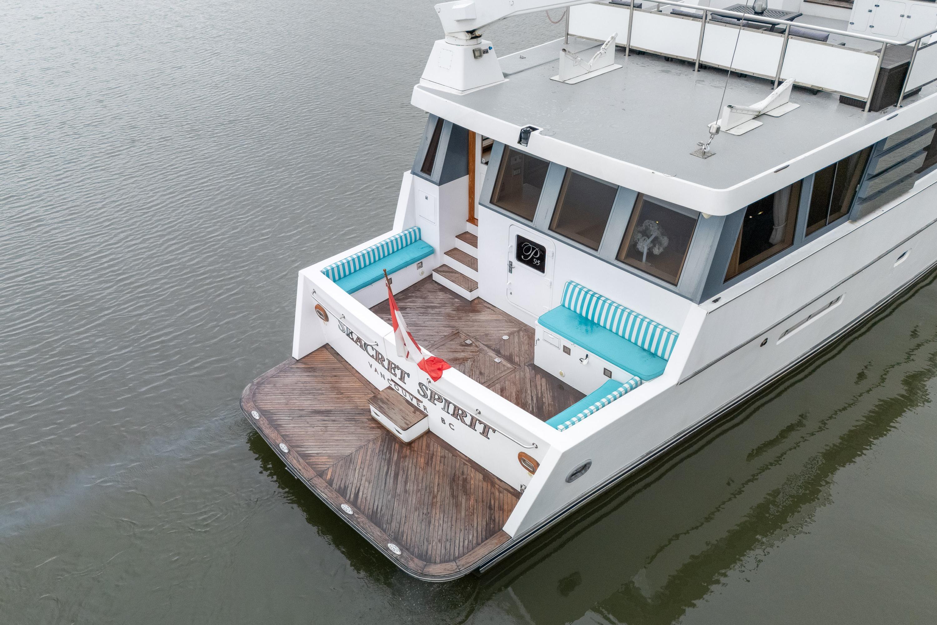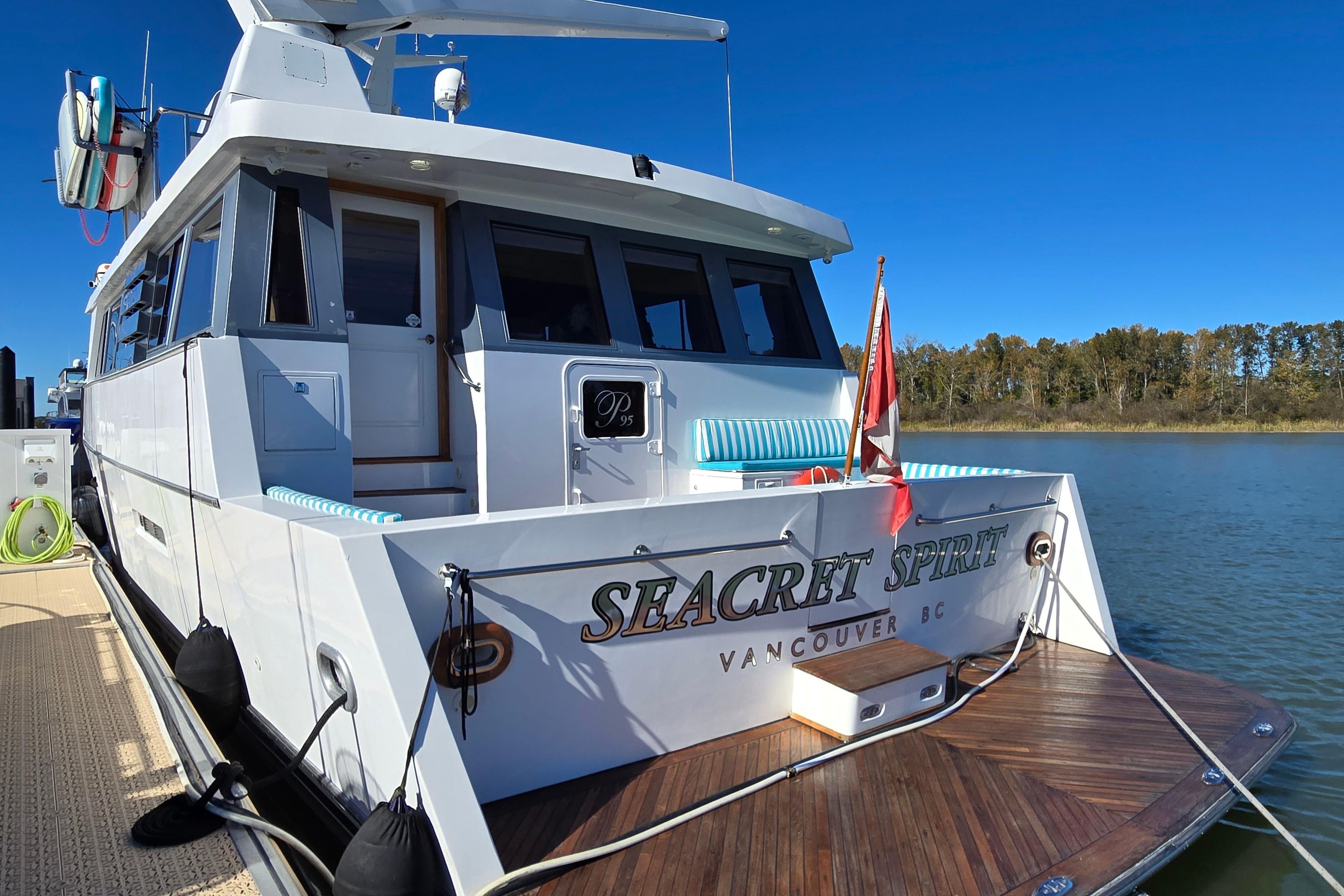 Seacret Spirit – a 95' Palmer Marine, Jack Sarin-designed fiberglass motor yacht built in Richmond, BC. in 1989 and fully refitted in 2000. This vessel blends classic style, a practical design, and incredible comfort. Warm, bright, and welcoming throughout, the maple-paneled interiors illuminate with natural light from 14 large salon windows and galley ports. Cruising effortlessly and efficiently at 10–12 knots due to twin 820 hp MAN V10 diesels (2000). This pilothouse classic accommodates up to 12 guests, there are 3 large staterooms (including a full-beam master with jacuzzi tub) plus two separate crew cabins.