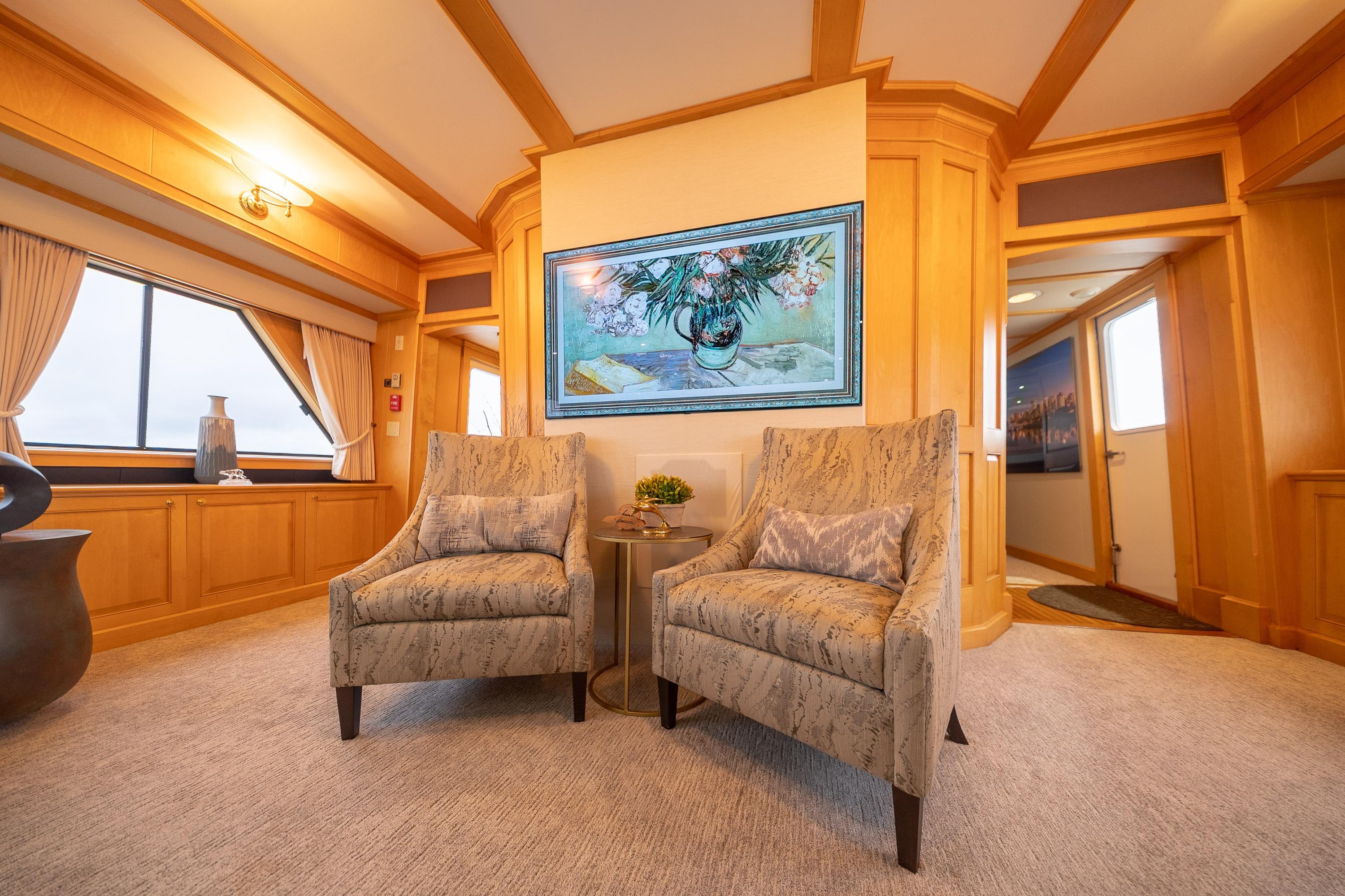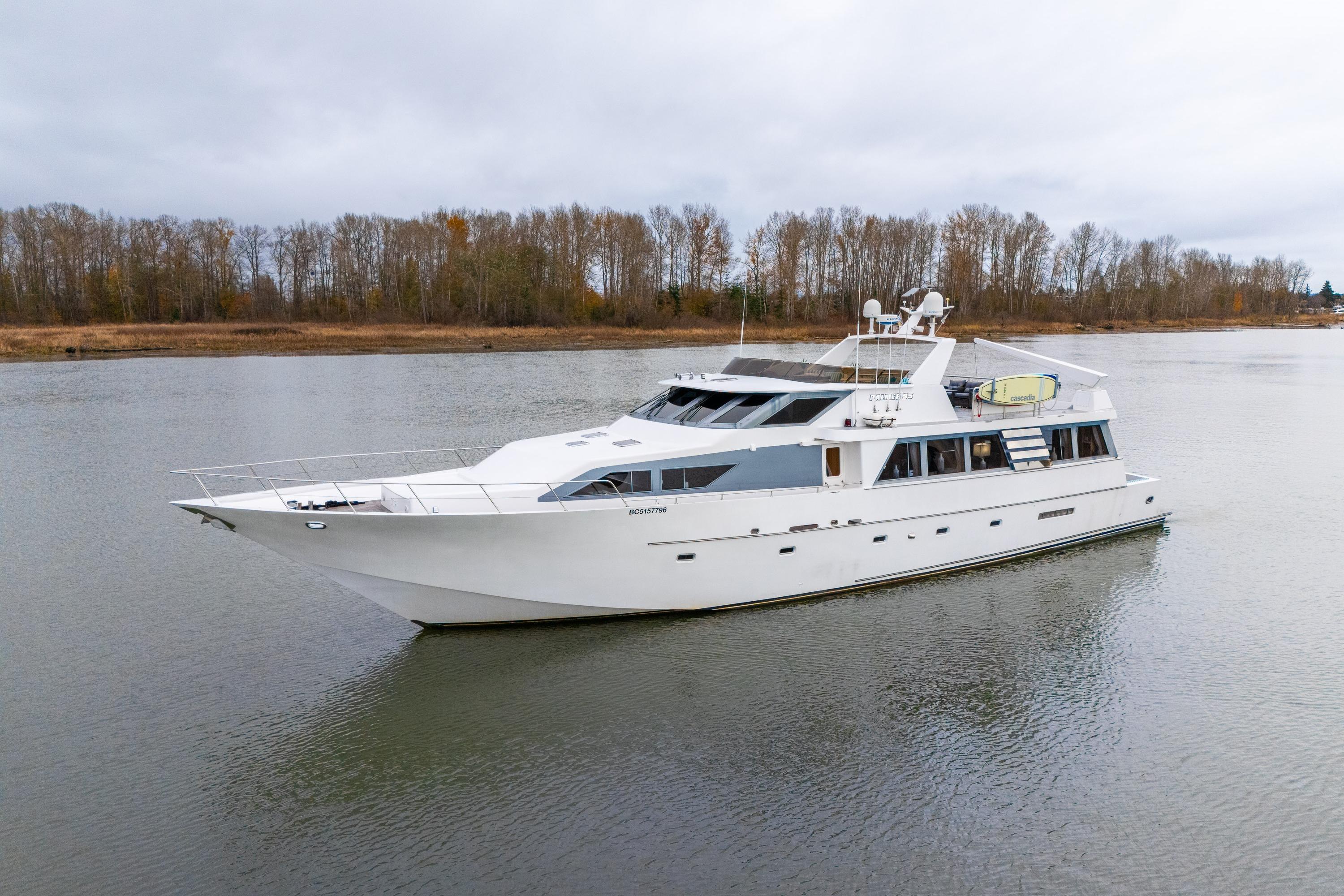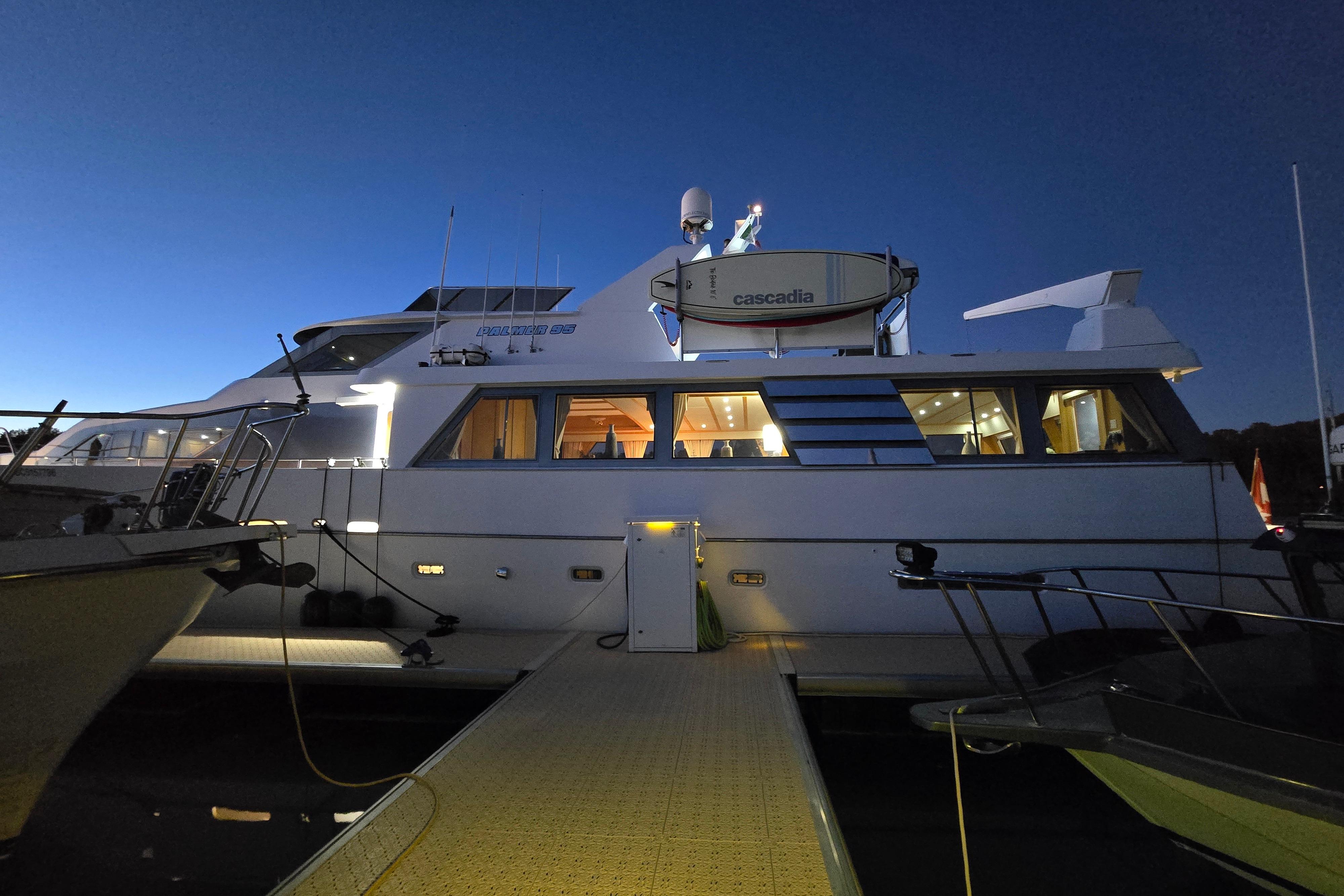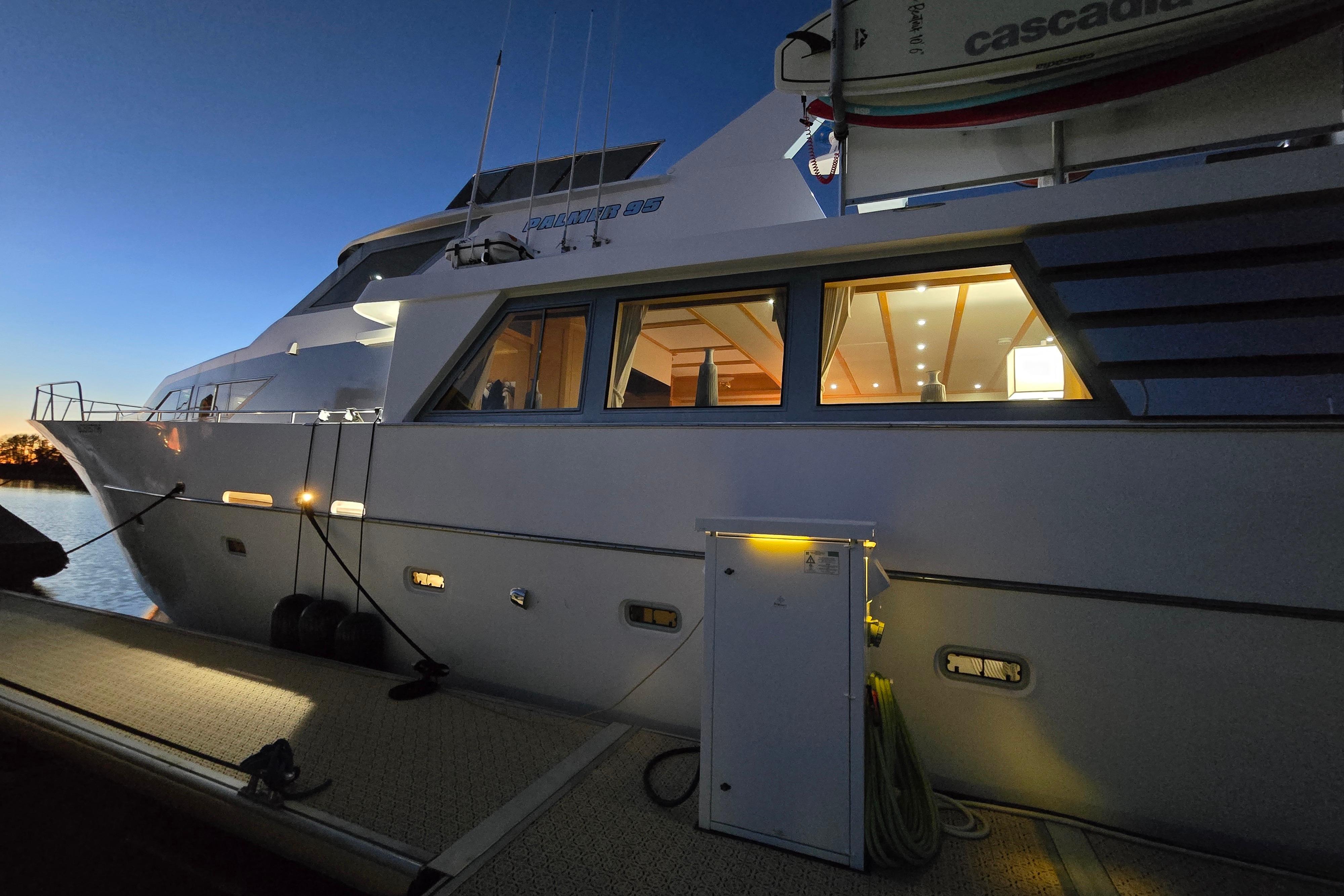 Seacret Spirit – a 95' Palmer Marine, Jack Sarin-designed fiberglass motor yacht built in Richmond, BC. in 1989 and fully refitted in 2000. This vessel blends classic style, a practical design, and incredible comfort. Warm, bright, and welcoming throughout, the maple-paneled interiors illuminate with natural light from 14 large salon windows and galley ports. Cruising effortlessly and efficiently at 10–12 knots due to twin 820 hp MAN V10 diesels (2000). This pilothouse classic accommodates up to 12 guests, there are 3 large staterooms (including a full-beam master with jacuzzi tub) plus two separate crew cabins.