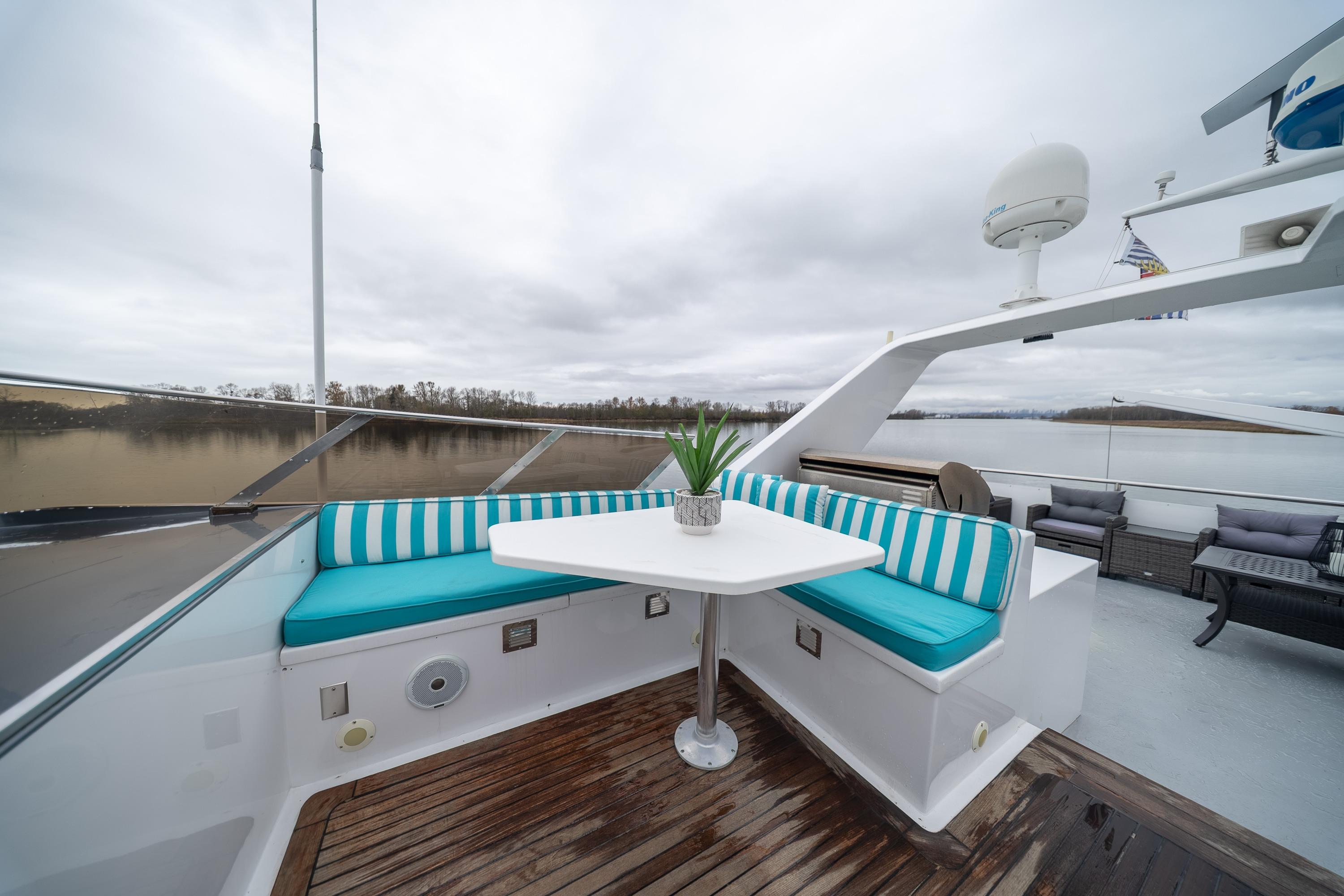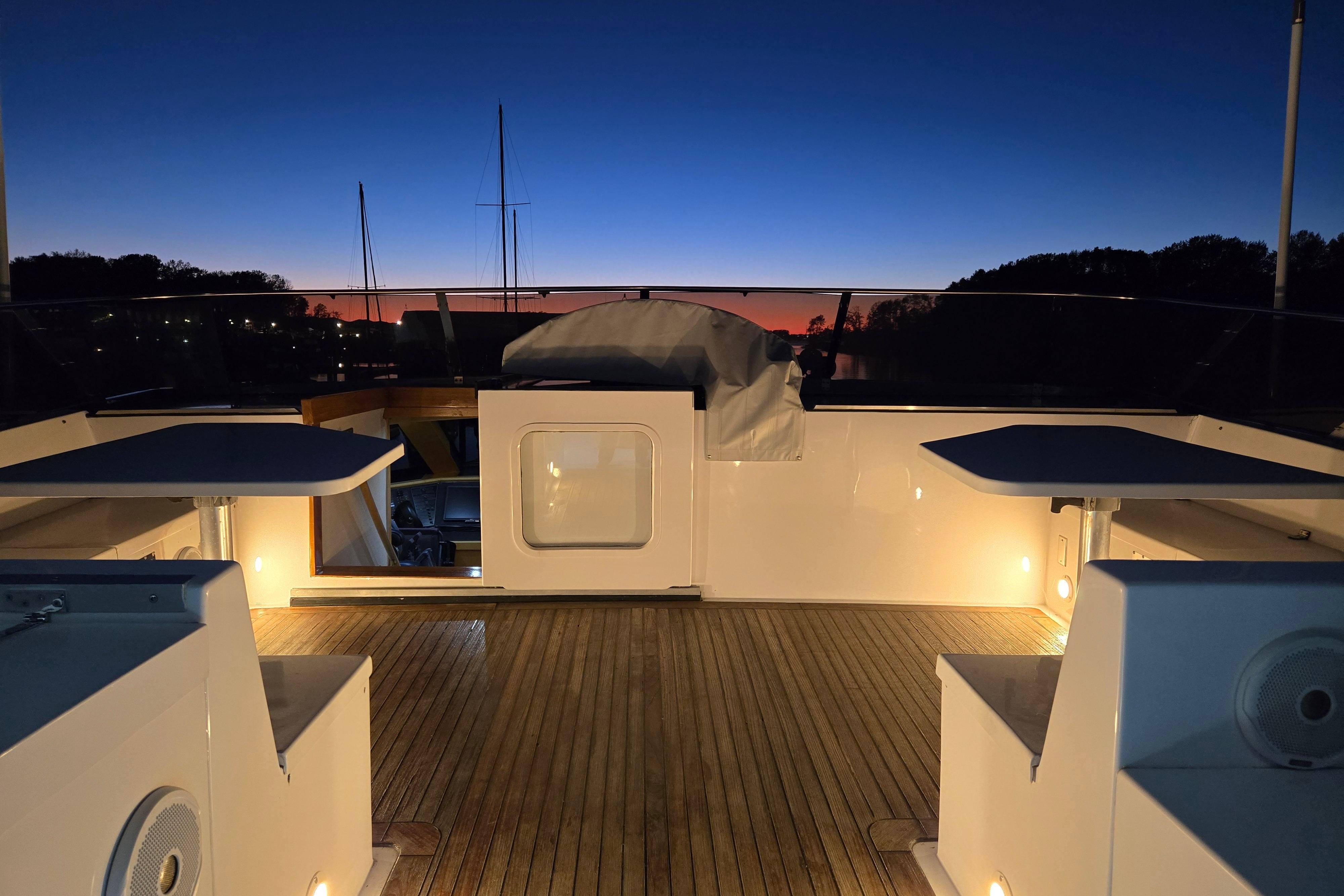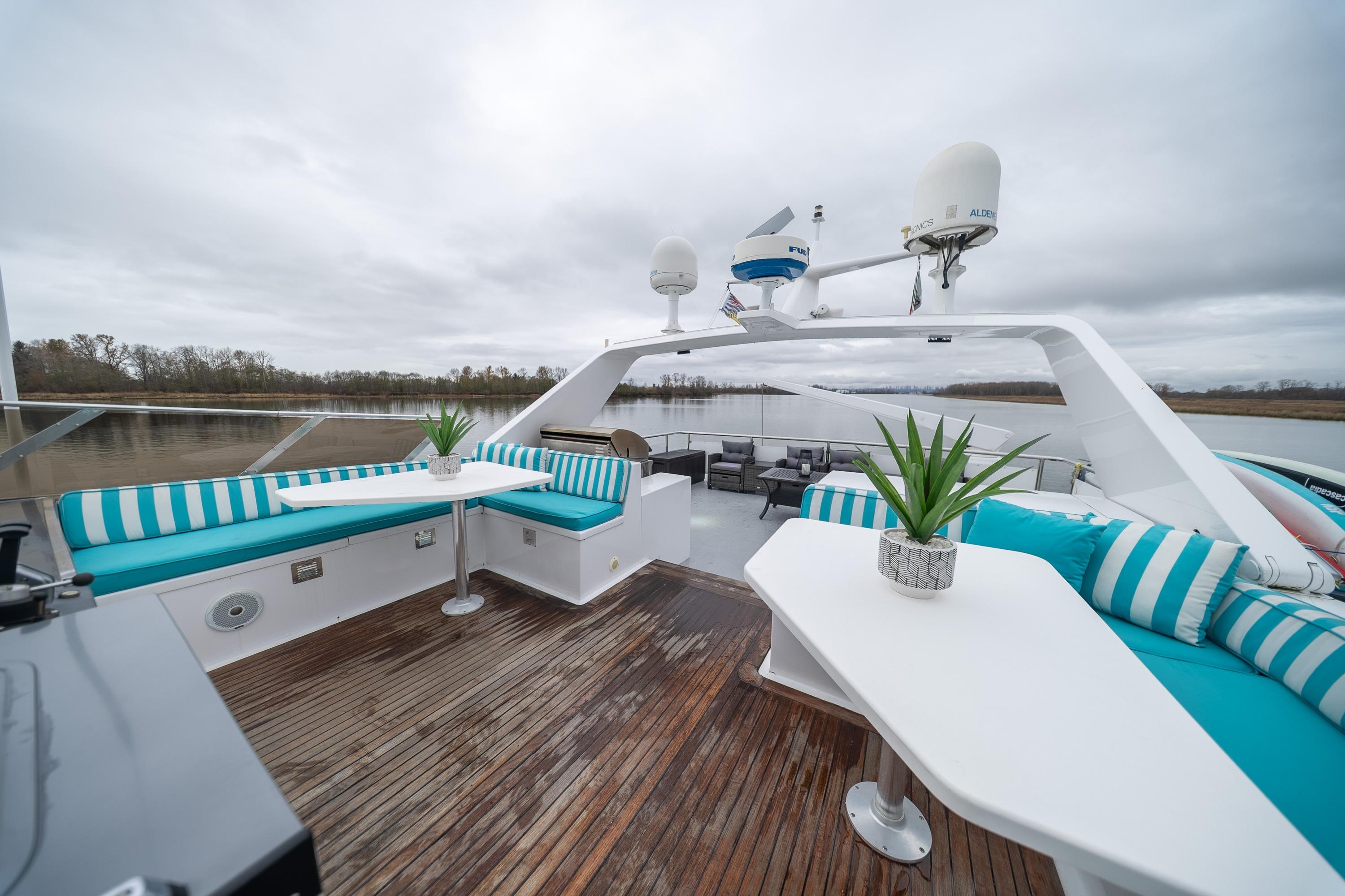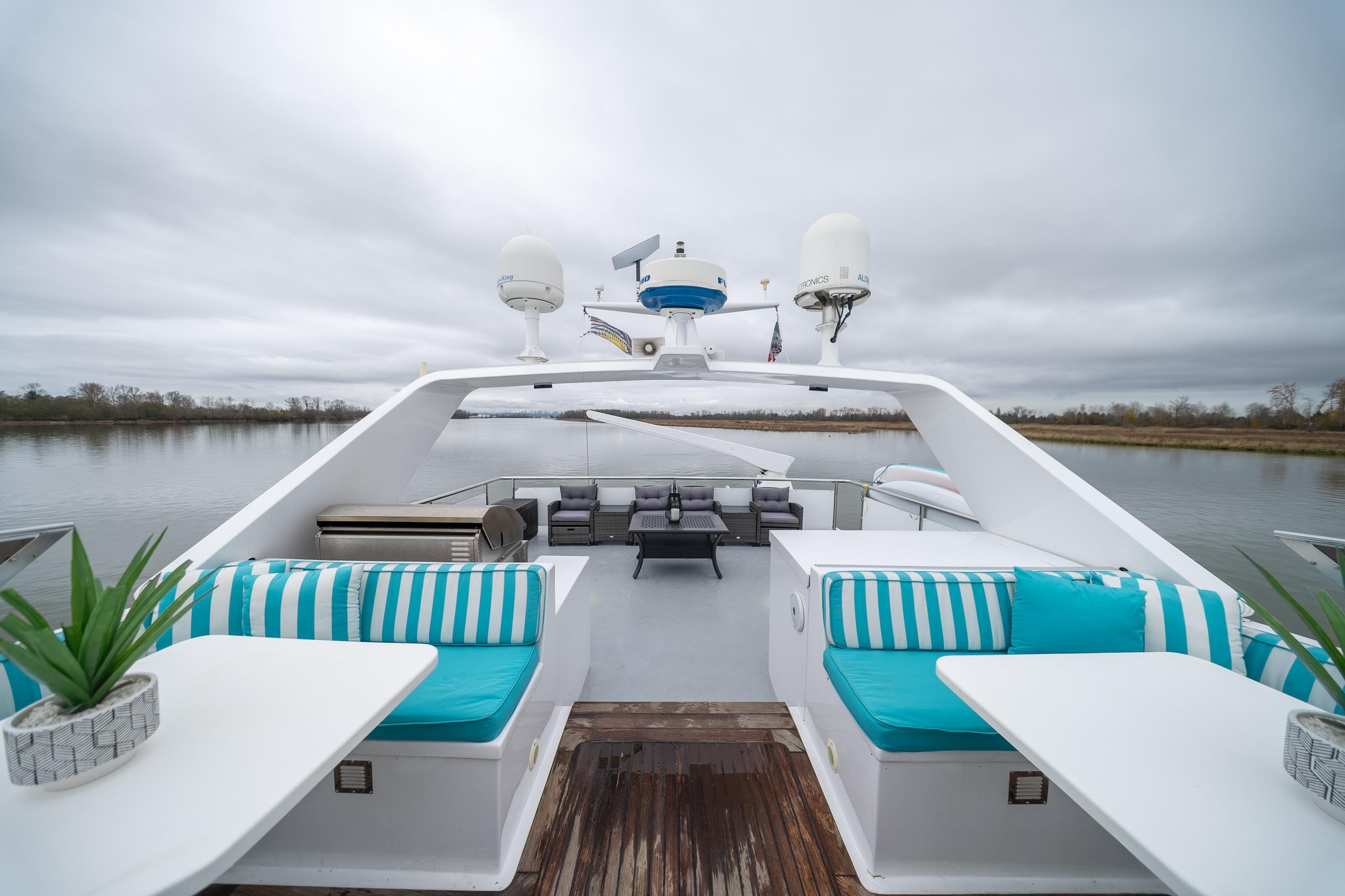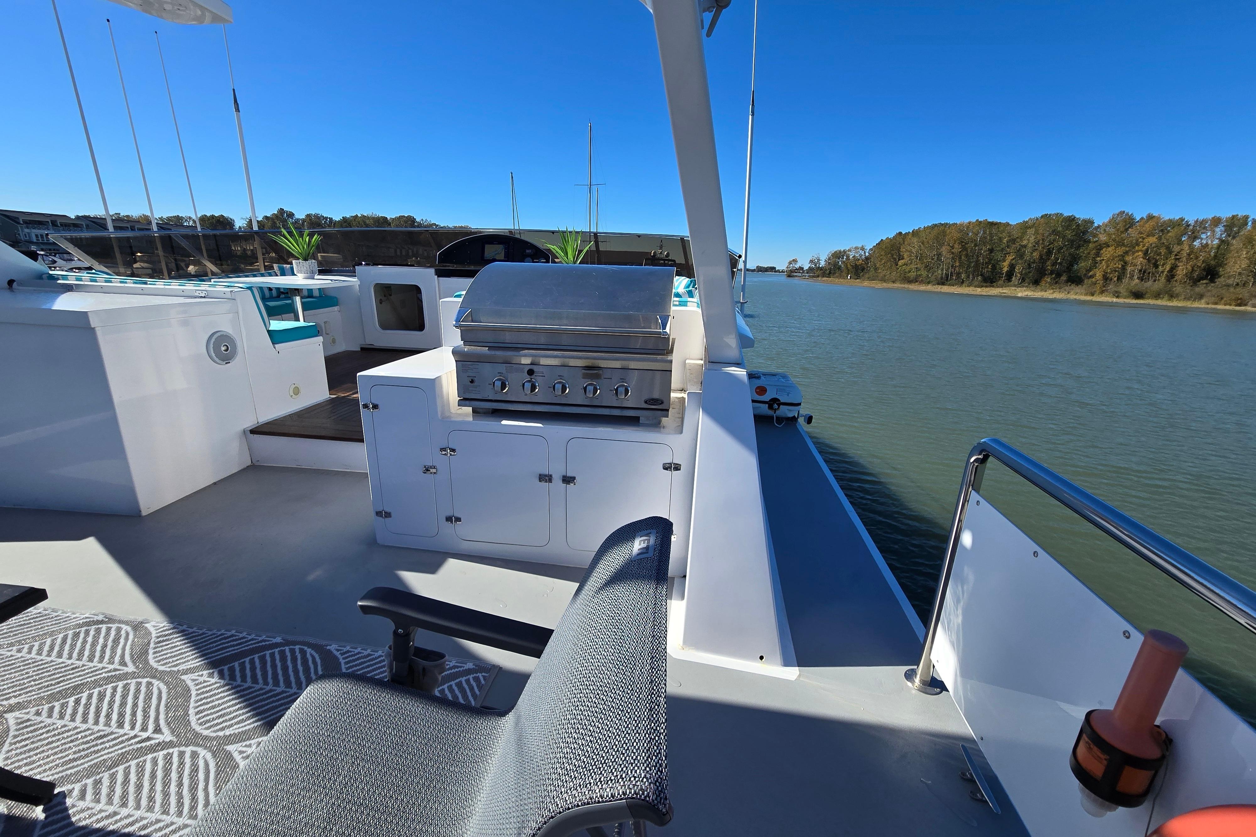 - Upper sundeck with Fisher Paykel BBQ, seating for 16, hydraulic davit, and articulating radar arch – ideal for al fresco gatherings