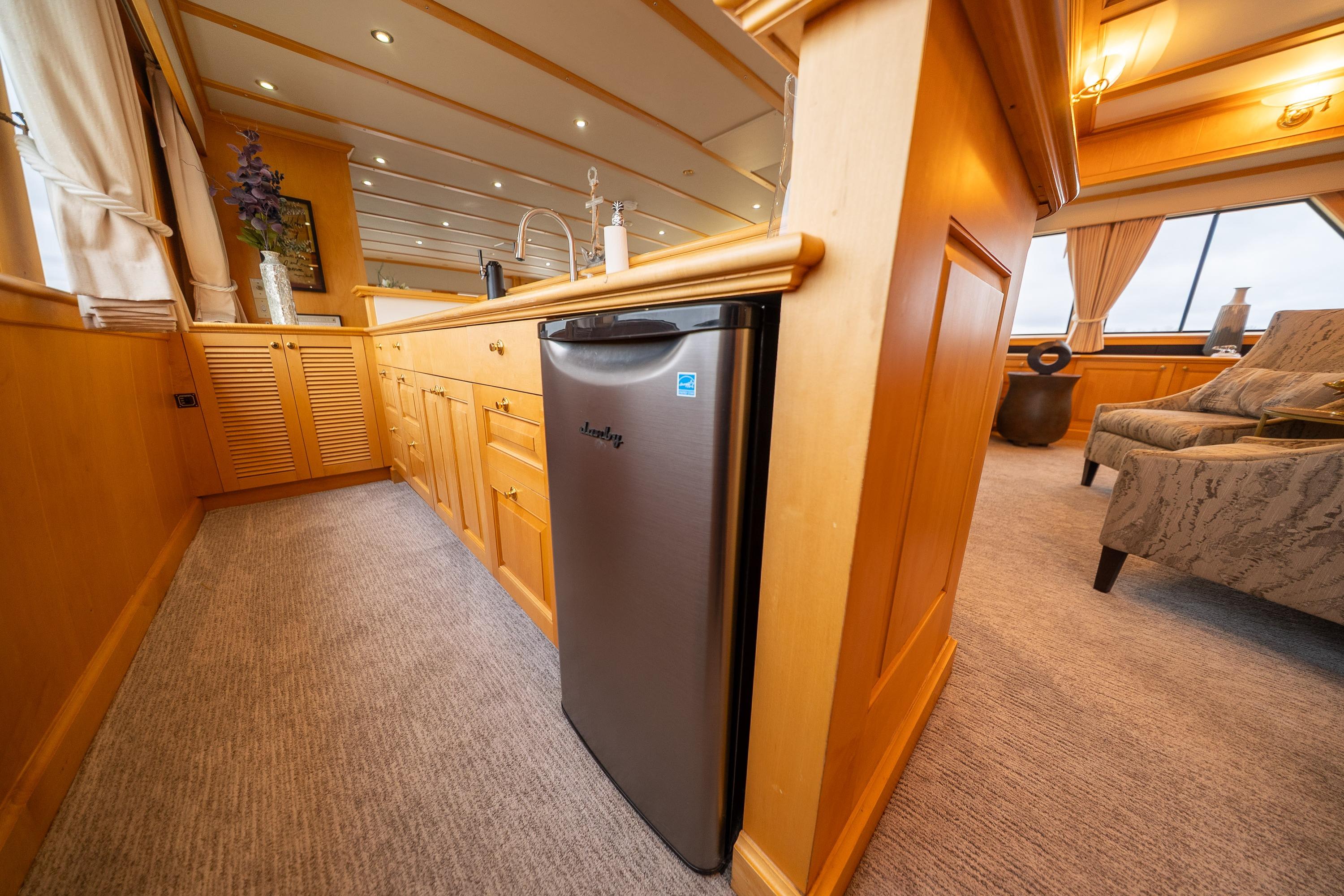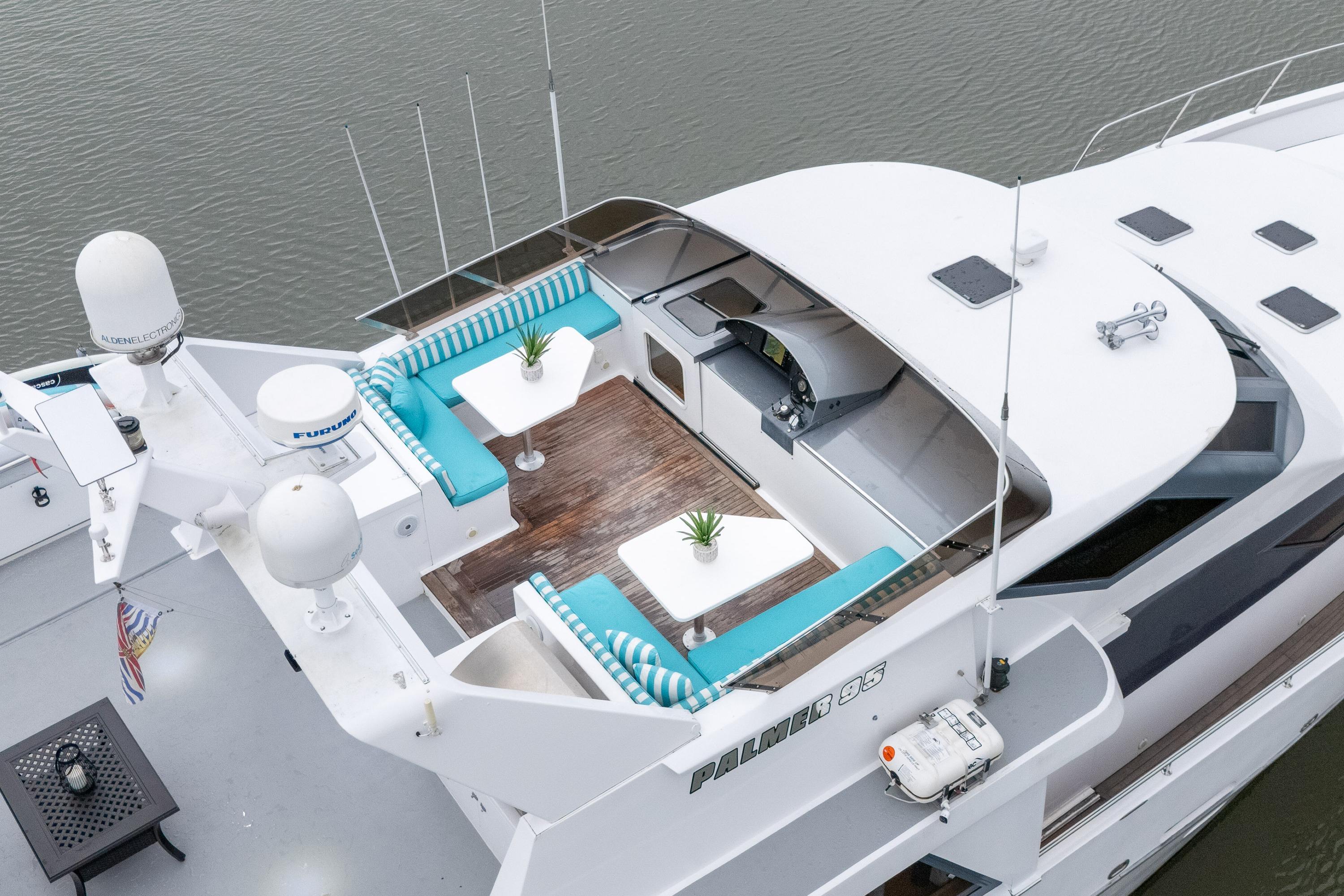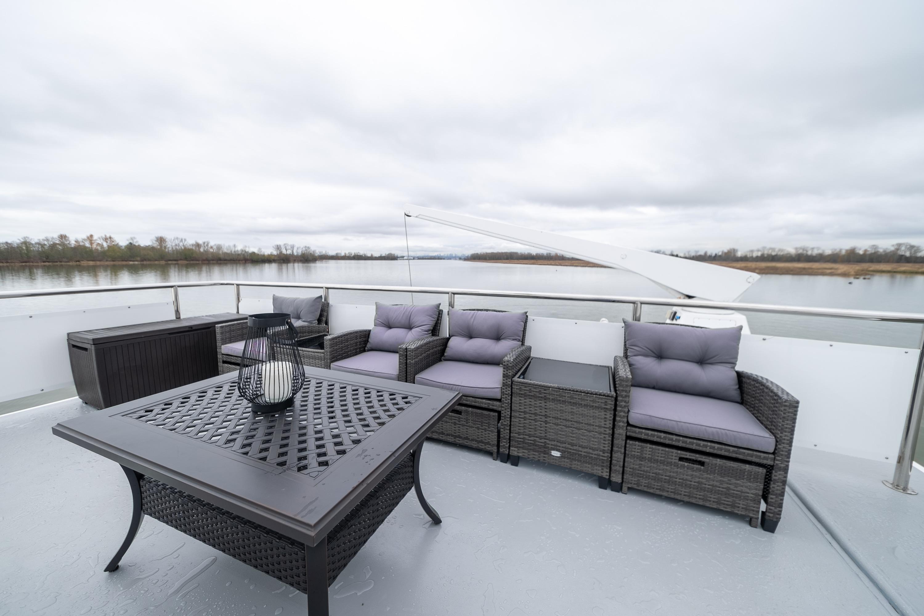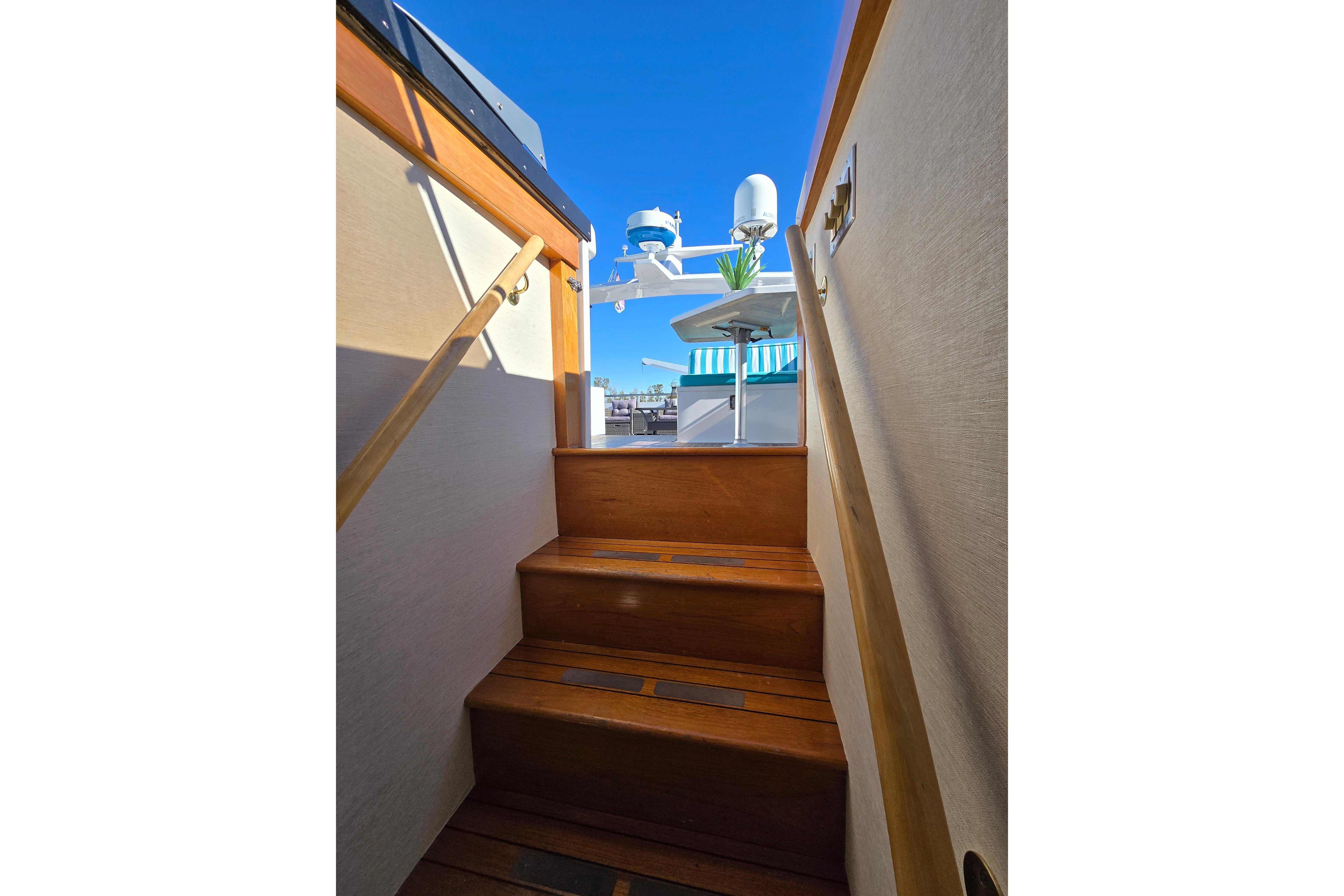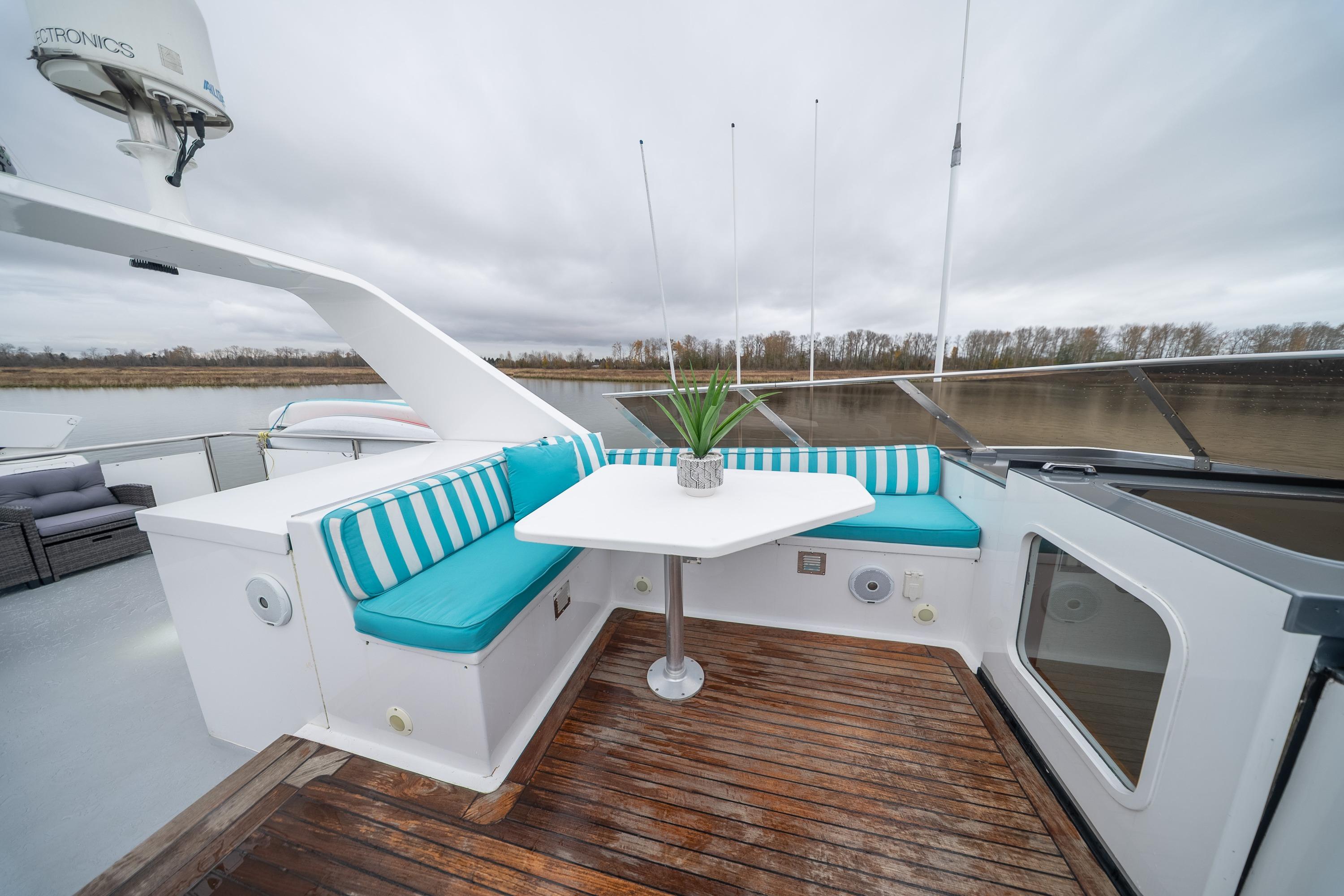 - Upper sundeck with Fisher Paykel BBQ, seating for 16, hydraulic davit, and articulating radar arch – ideal for al fresco gatherings