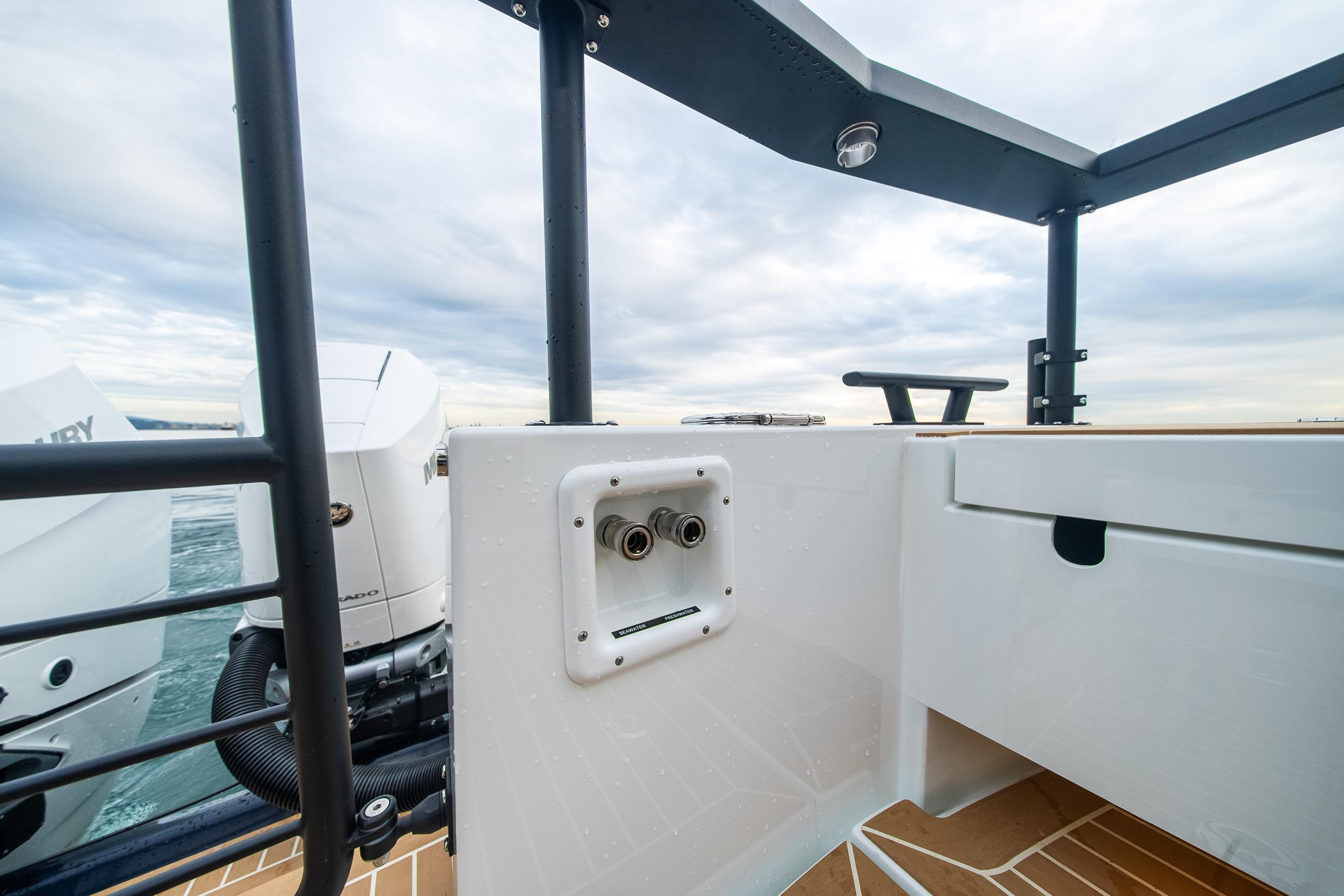 Shower on aft deck from galley pump, fresh water hot&cold