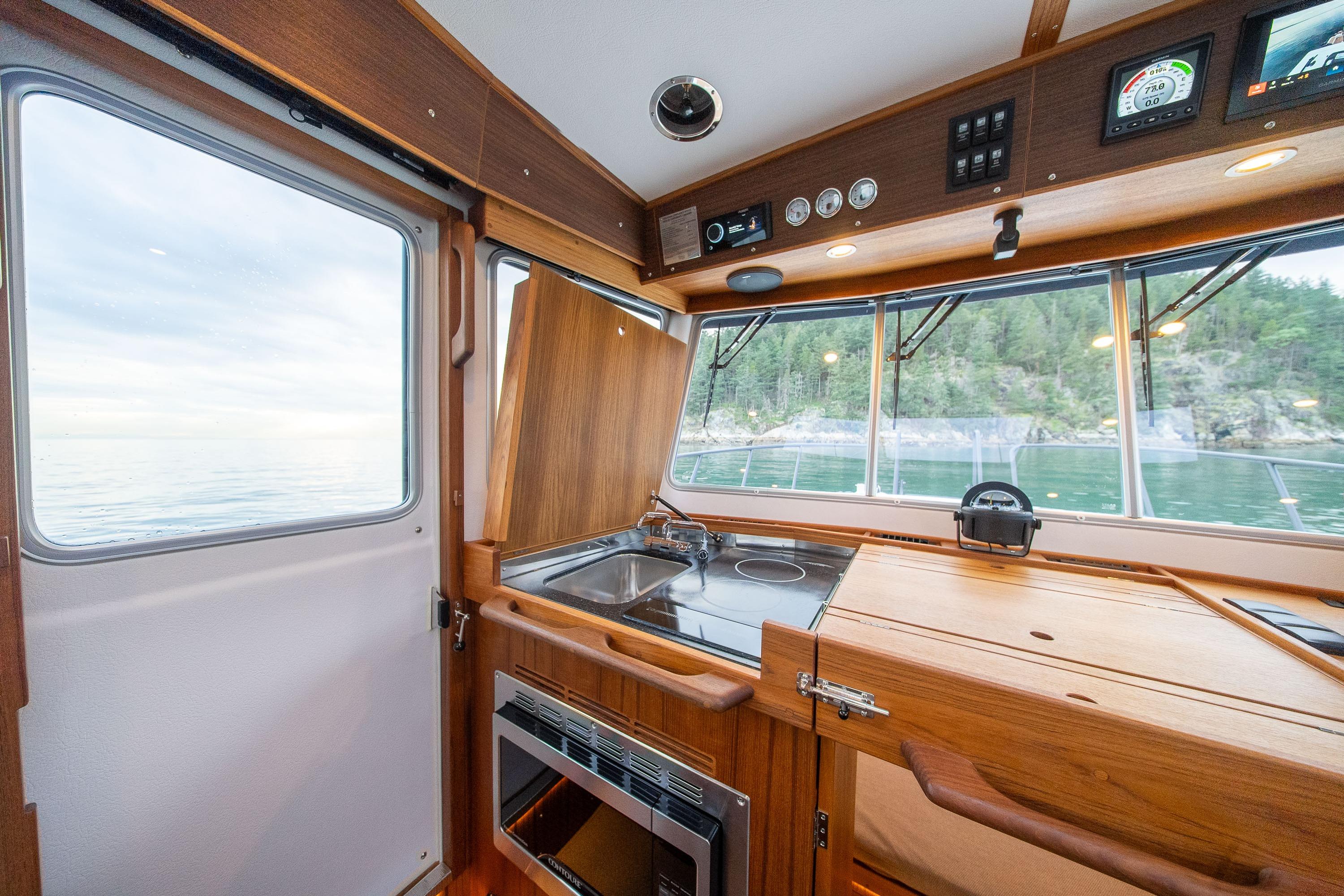 Galley, Hi-macs “Cima” table top, stainless sink. Induction cook top Kenyon B80321