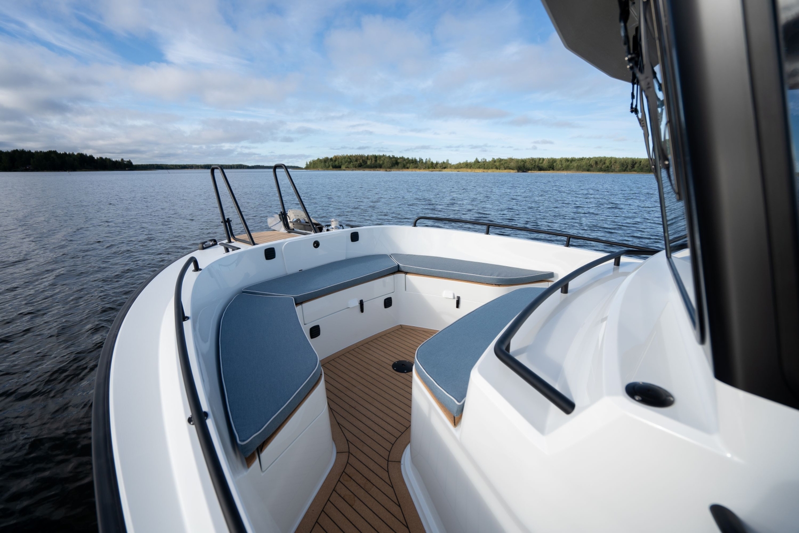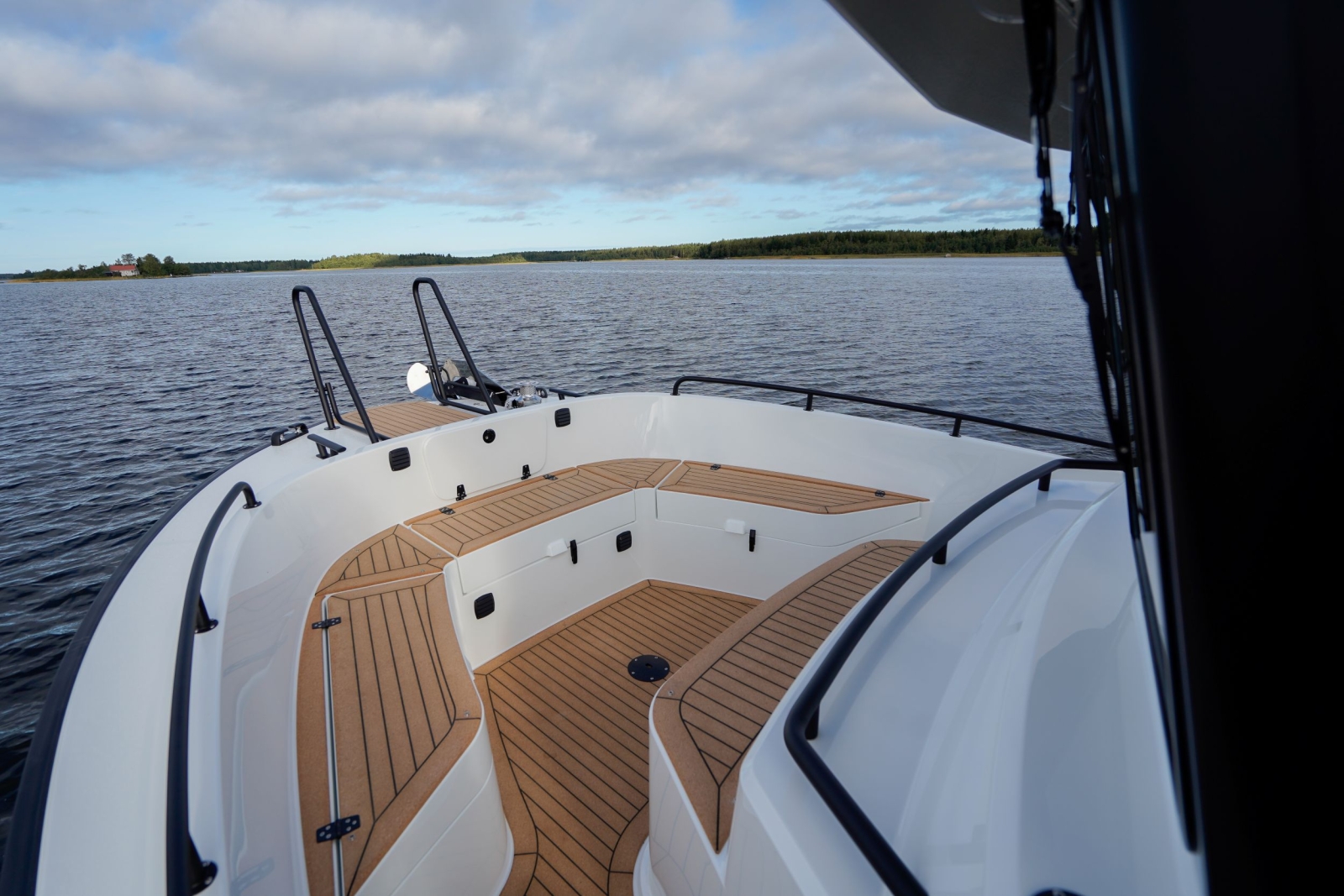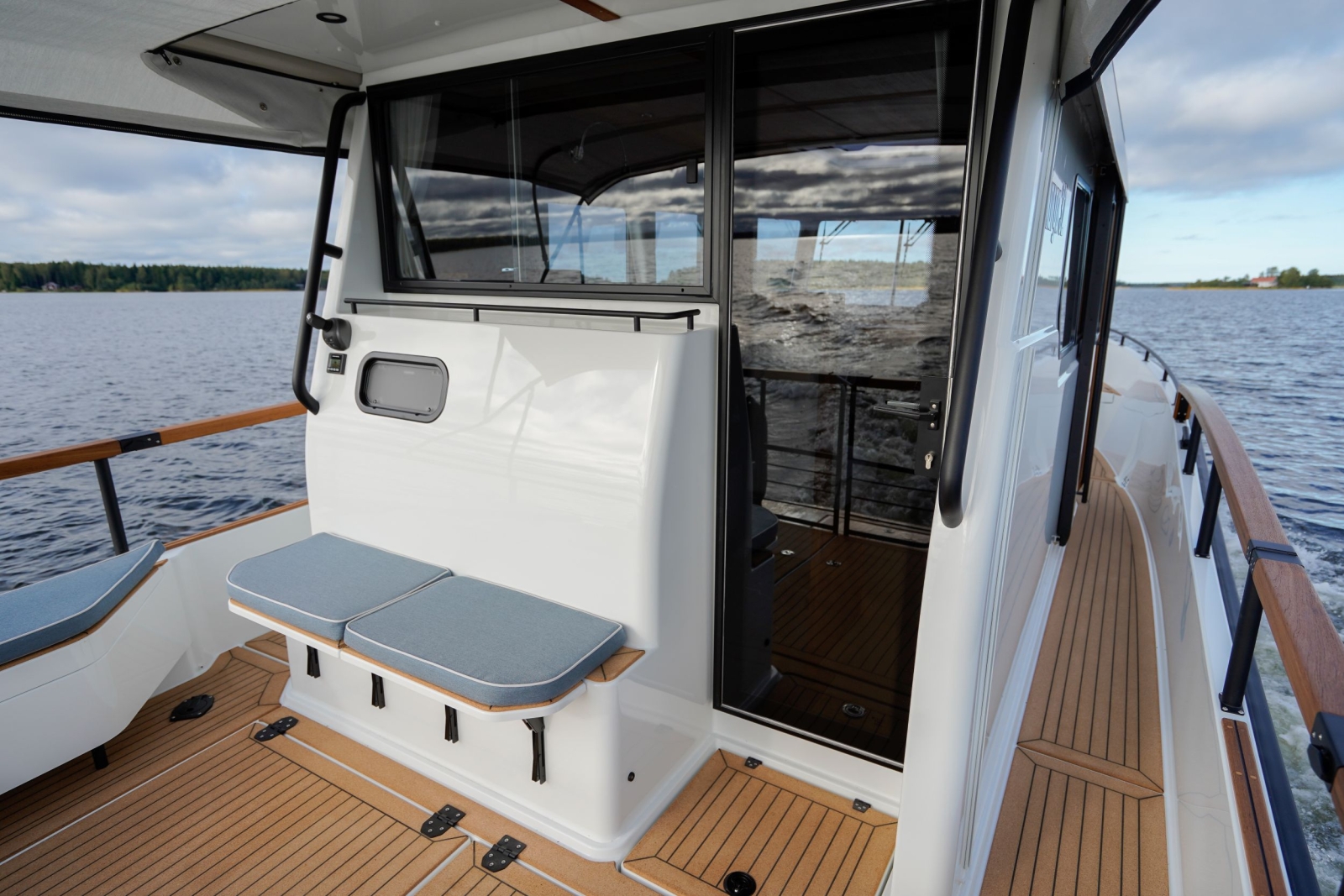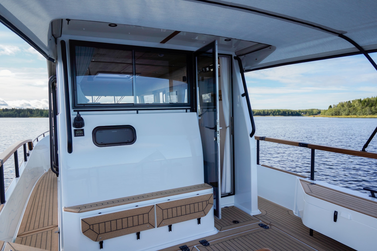 AFT DOOR (AD). The single aft door enables convenient access to the spacious aft deck with double transom gates and a large swimming platform. It’s the perfect choice for demanding fishing as well as commuting and transport.