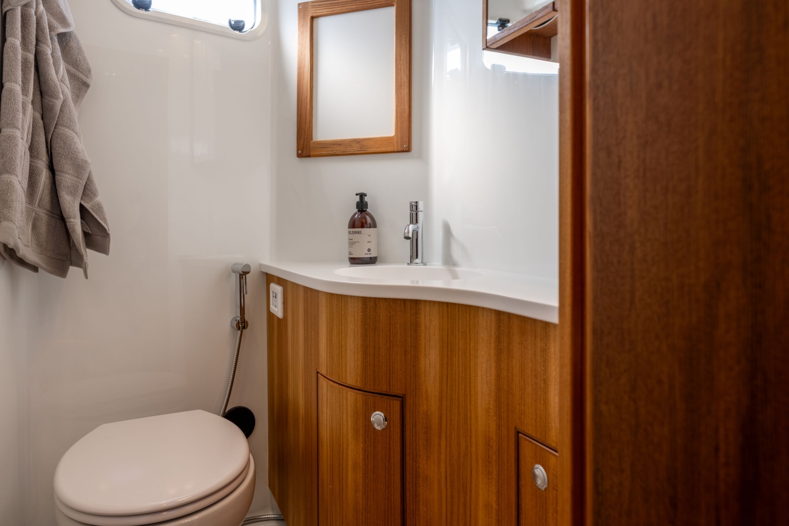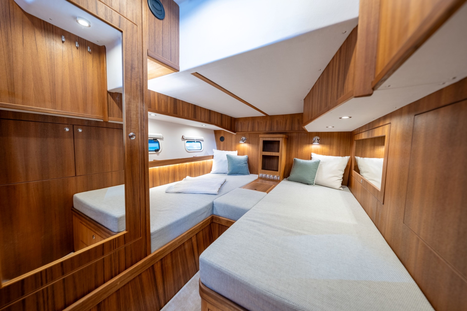 CABIN LAYOUT. Both the standard fore cabin, featuring a double berth on the starboard side, and the Comfort Fore Cabin (CFC) with an island bed come with a toilet and a small side berth across the hull. Alternatively, you can choose a larger toilet with a shower, replacing the side berth with a spacious storage space.
