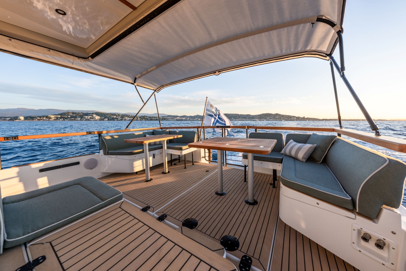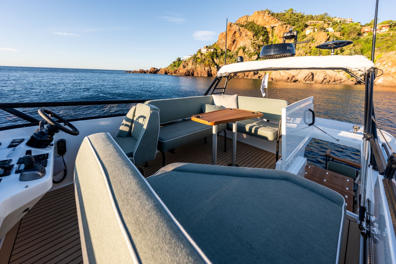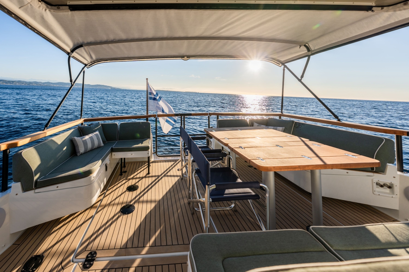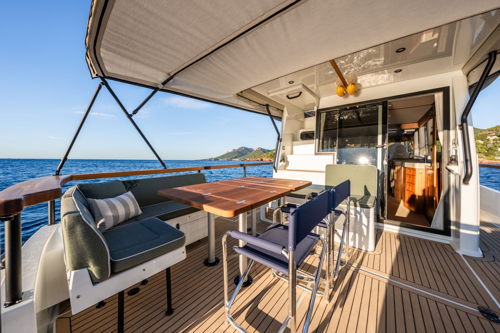 FLYBRIDGE. The flybridge (FB) seats seven persons comfortably and elevates your boating experience to a new level. The flybridge can be equipped with an extra foldable wind shield or a Bimini top for hot climates.
