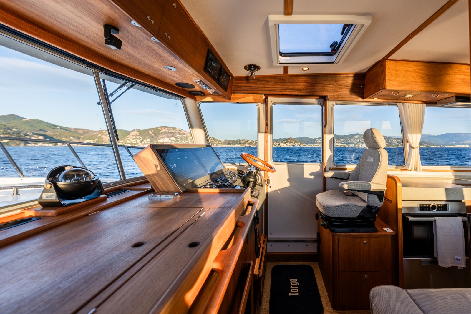AFT DOOR. Manual glass sliding door made from tempered glass enables convenient access to the aft deck. The Aft Door (AD) also makes the pilothouse feel even brighter and more spacious.